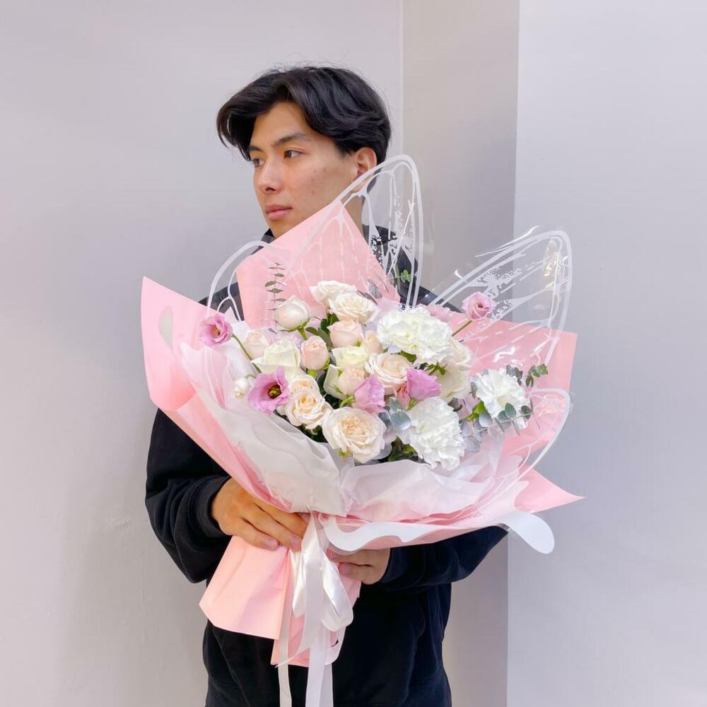 Роза кустовая - 3 шт. Эвкалипт - 1 шт. Роза - 3 шт. Эустома - 1 шт. Диантус - 3 шт.