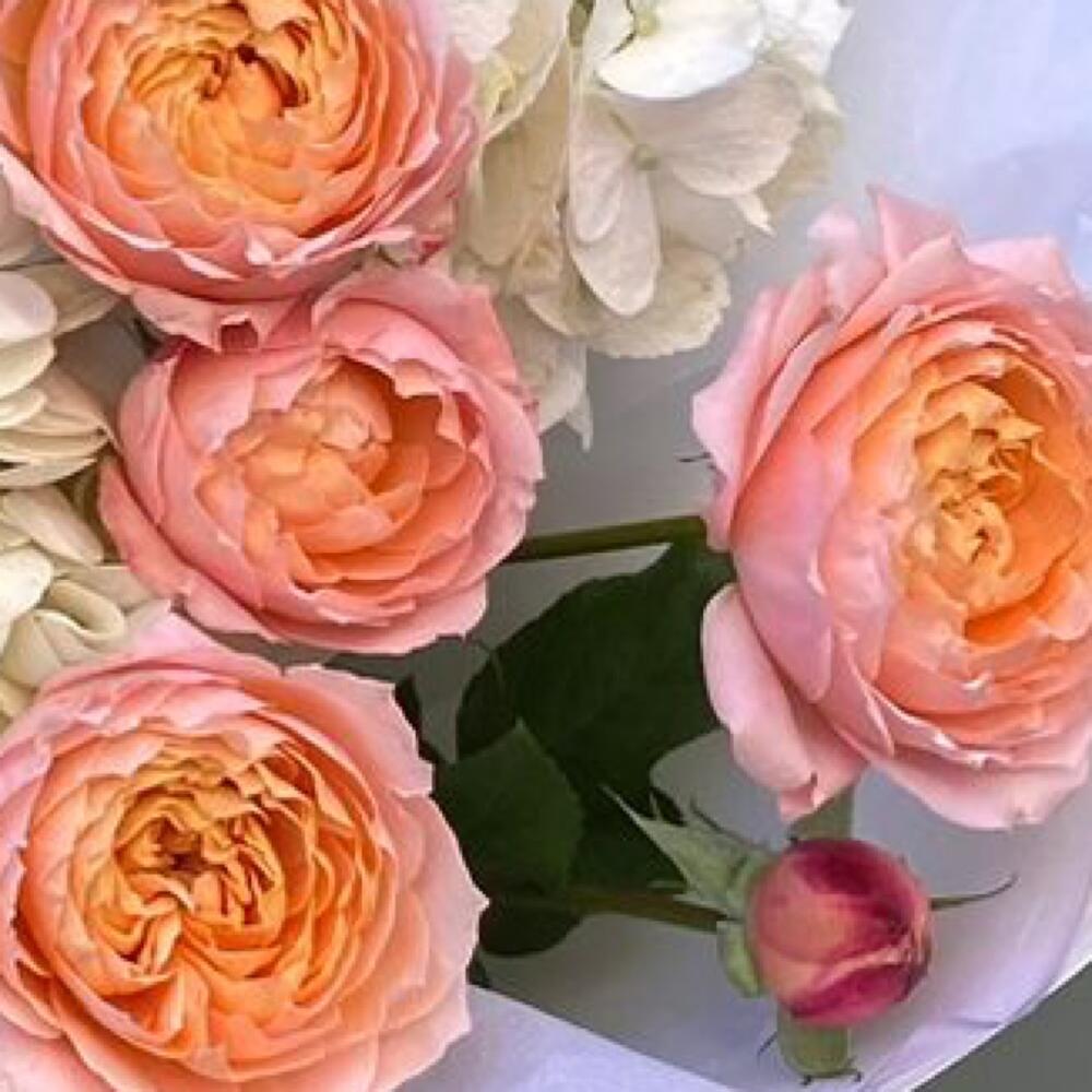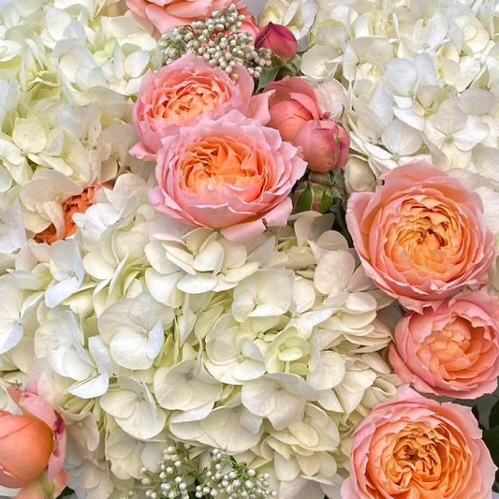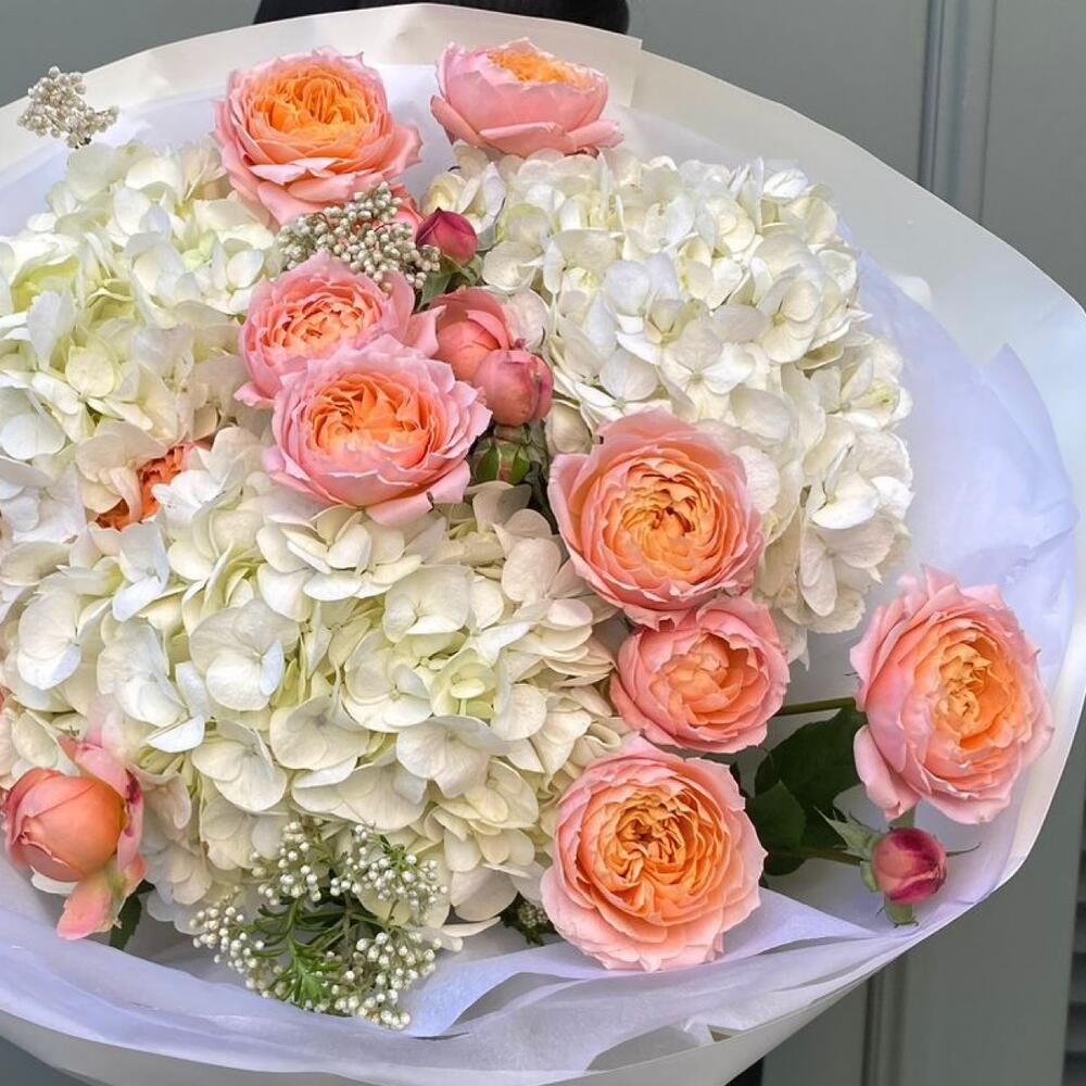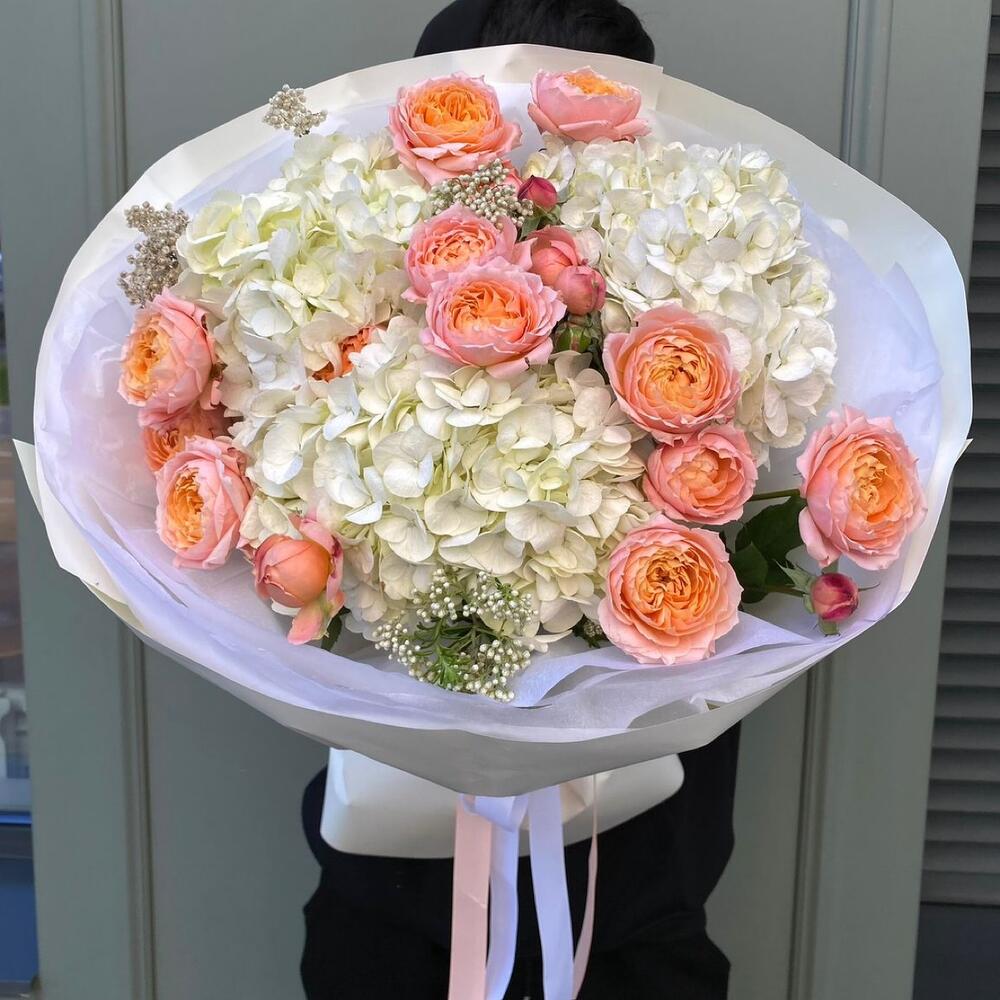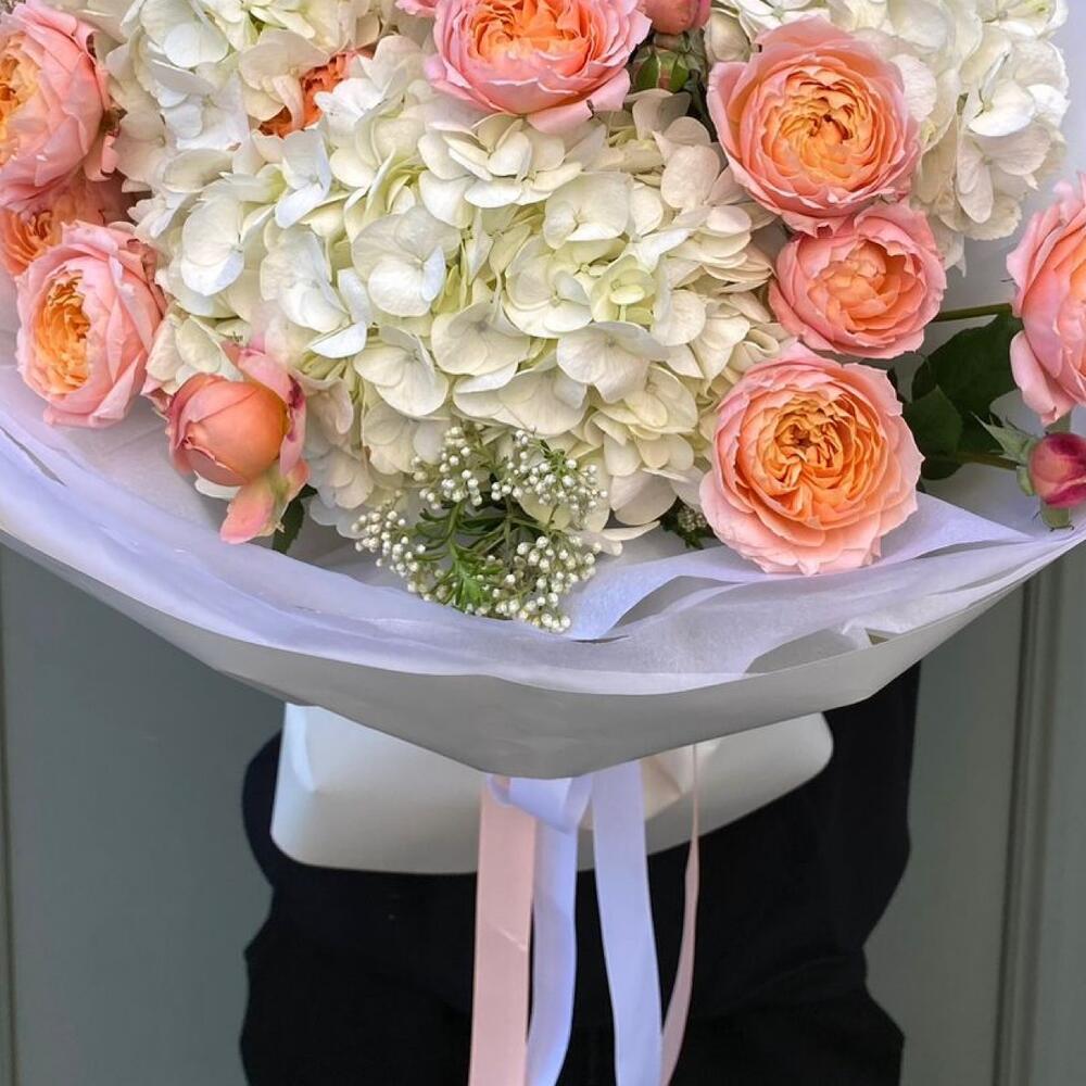 Гортензия - 3 шт. Роза кустовая пионовидная - 5 шт. Упаковка дизайнерская - 2 шт.