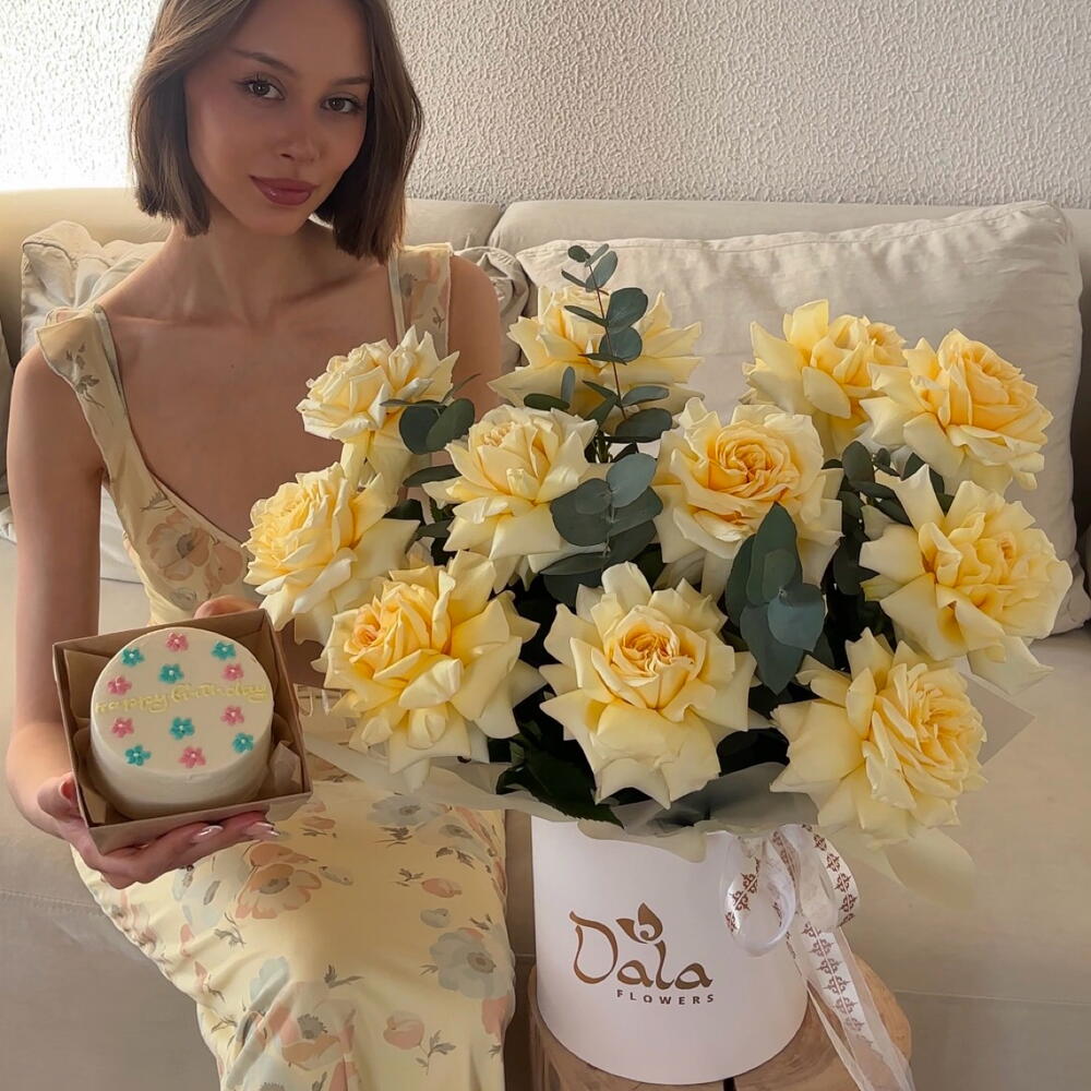 Эвкалипт Цинерея - 3 шт. пионовидные розы канделайт - 11 шт. шоколадный бенто торт вупи пай - 1 шт.