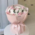 Нежный букет в стильной упаковке создан, чтобы дарить тепло и радость. Розовые розы добавляют утончённой романтики, а пушистые белые хризантемы придают свежести и воздушности. Акценты эвкалипта завершают композицию, наполняя её лёгким ароматом. Такой букет станет идеальным подарком на день рождения, юбилей или просто для знака внимания близкому человеку. Он гармонично впишется в интерьер и надолго сохранит своё очарование. Поставьте букет в чистую вазу с прохладной водой, добавив питательный раствор для цветов. Ежедневно меняйте воду и подрезайте стебли на 1–2 см под углом. Держите букет подальше от прямых солнечных лучей и сквозняков.