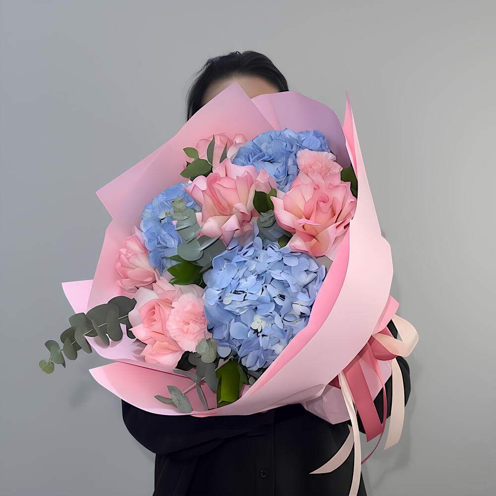 Этот авторский букет станет прекрасным символом ваших самых теплых и нежных чувств. Небольшой, но вместе с тем утонченный и изысканный букет объединяет в себе свежий эвкалипт, любимые многими нежно-розовые розы и загадочные голубые гортензии. С таким букетом любой повод станет особенным, а обычный день превратится в праздник.