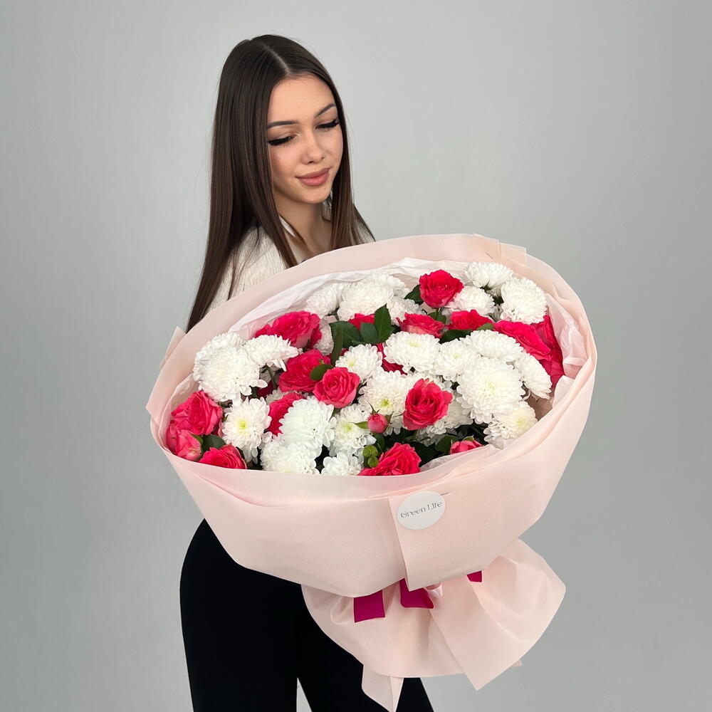 «Нежное признание» — изящный букет с розовыми розами и белыми хризантемами, наполненный лёгкостью и теплом. Подойдёт для искренних чувств, заботы и трогательных моментов.