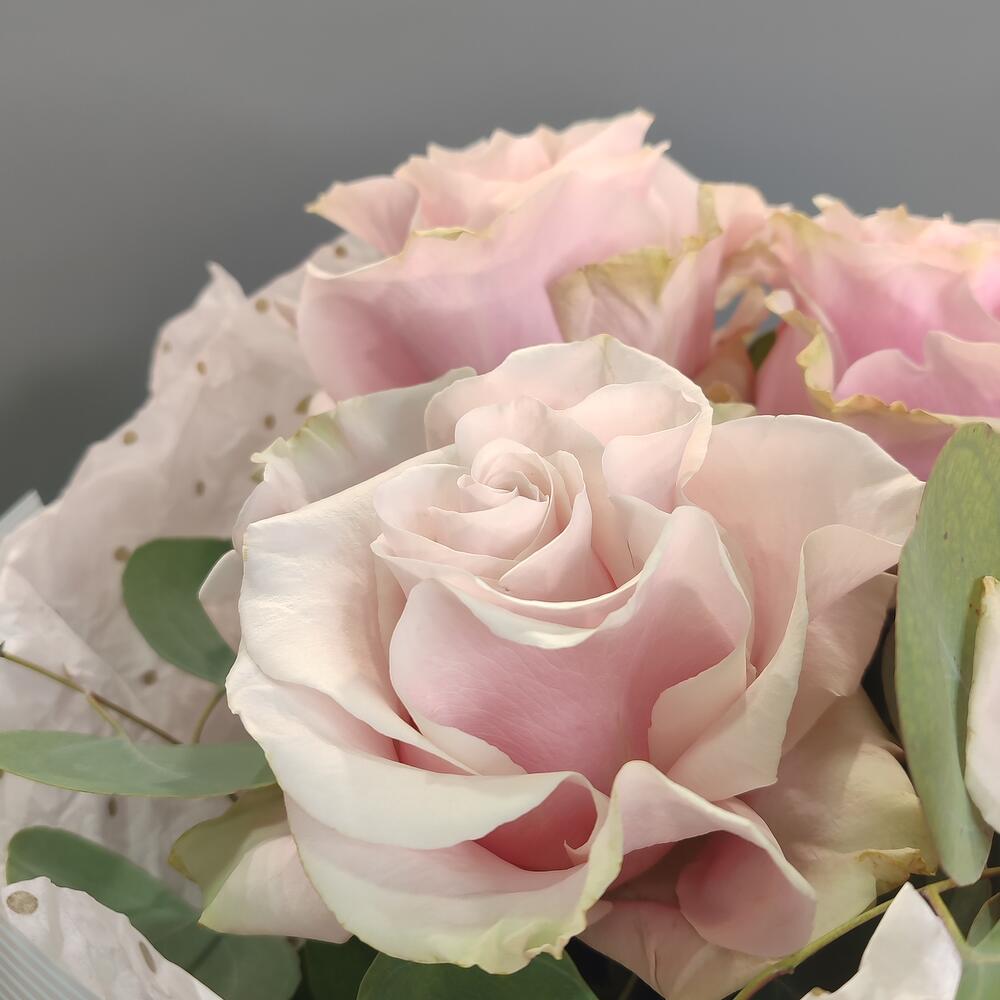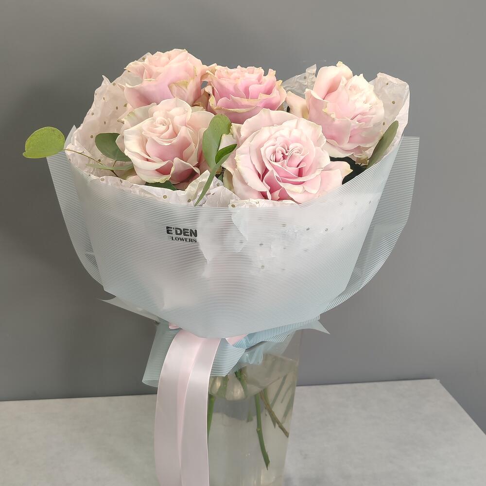 Букет из розы «Пинк Мондиаль» — тихая нежность Пять светло-розовых роз, собранных аккуратно и деликатно. Оттенок мягкий, почти прозрачный — словно лёгкий румянец на светлой коже. Этот букет про трепет. Про бережное отношение. Про чувство, которое хочется сохранить. Он выглядит скромно по размеру, но очень глубоко по настроению. Ничего лишнего — только чистый розовый оттенок и спокойная красота. Оттенок: нежно-пудровый розовый Настроение: трепет, искренность, деликатность Стойкость: до 7–10 дней Иногда пяти роз достаточно, чтобы сказать самое важное.