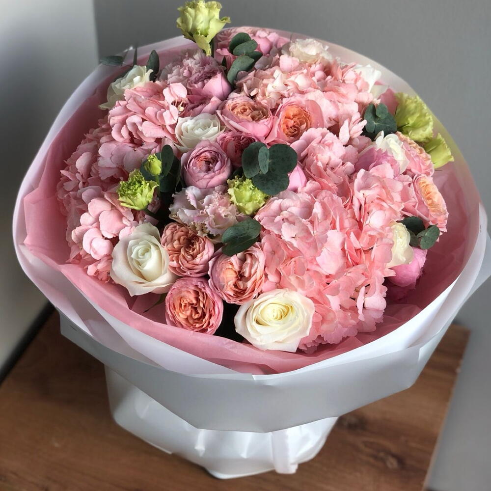 Роза - 7 шт. эустома розовая - 4 шт. Эвкалипт Цинерея - 3 шт. Гортензия Премиум Розовая - 3 шт. пионы видный спрей - 5 шт.