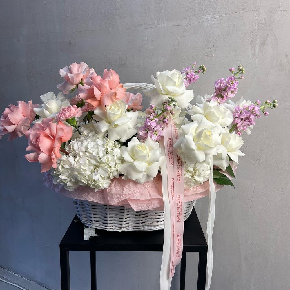 Гортензия - 2 шт. Маттиола - 4 шт. Диантус - 5 шт. розы - 13 шт.