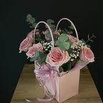 Гипсофила - 1 шт. Эвкалипт - 1 шт. Роза - 9 шт. Лента атласная - 1 шт. Оазис флористический - 1 шт. сумочка с ручками - 1 шт. открытка с вашими пожеланиями - 1 шт.