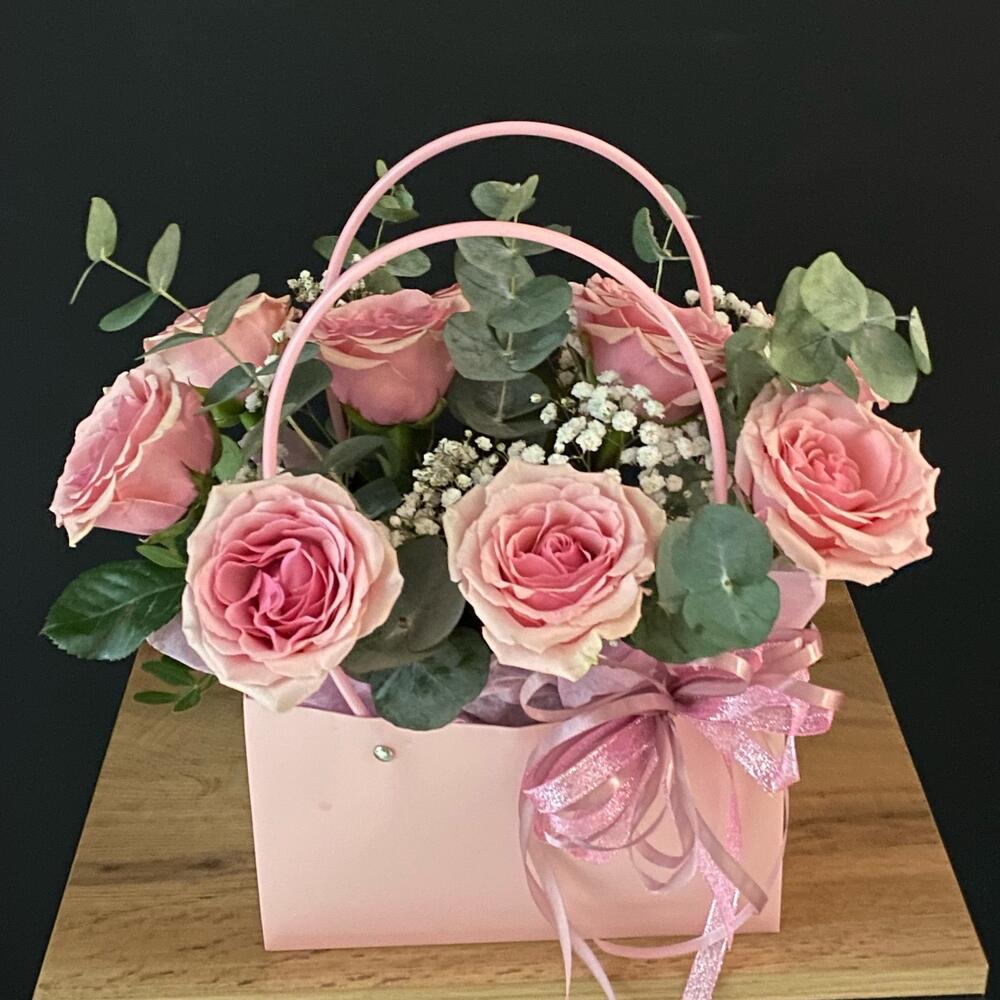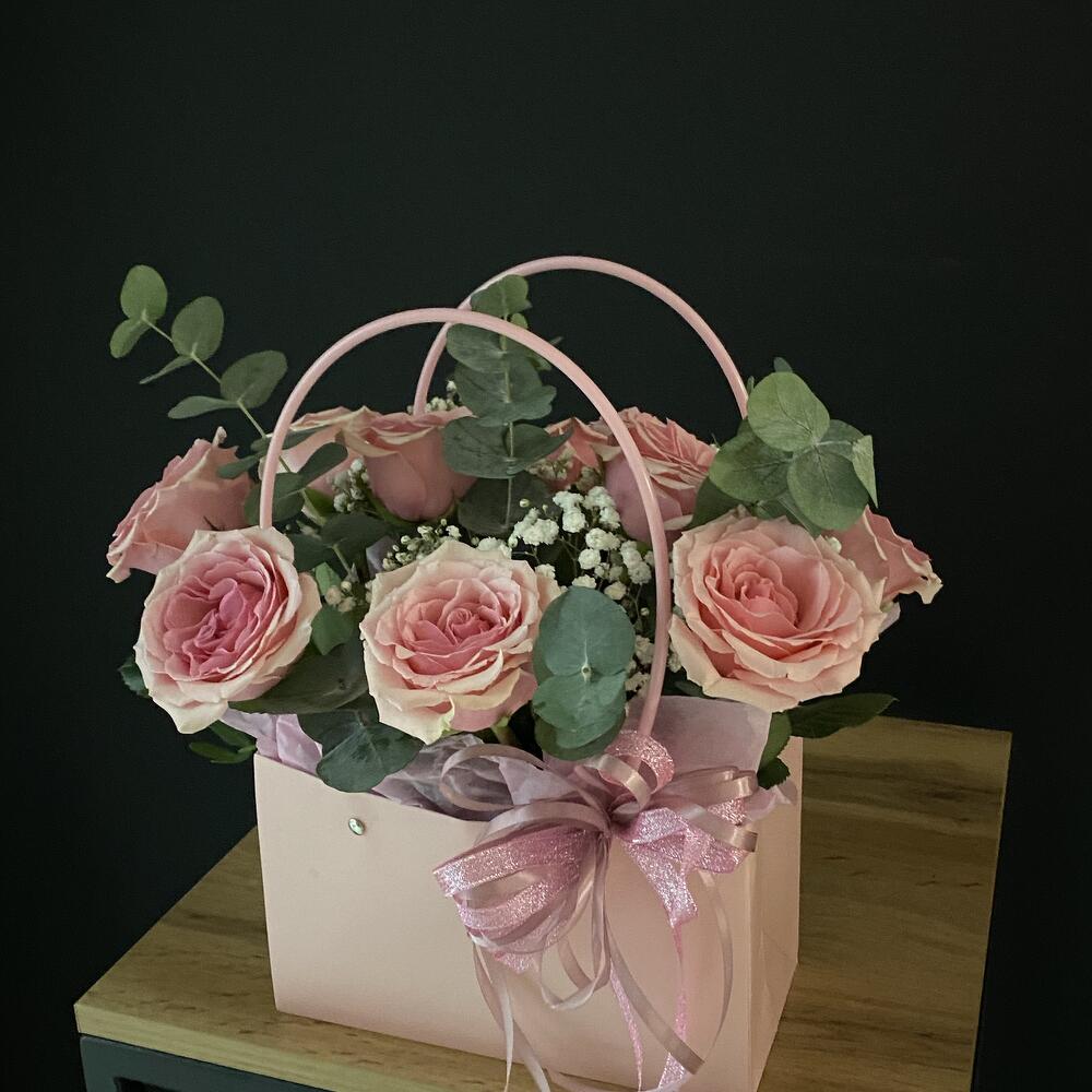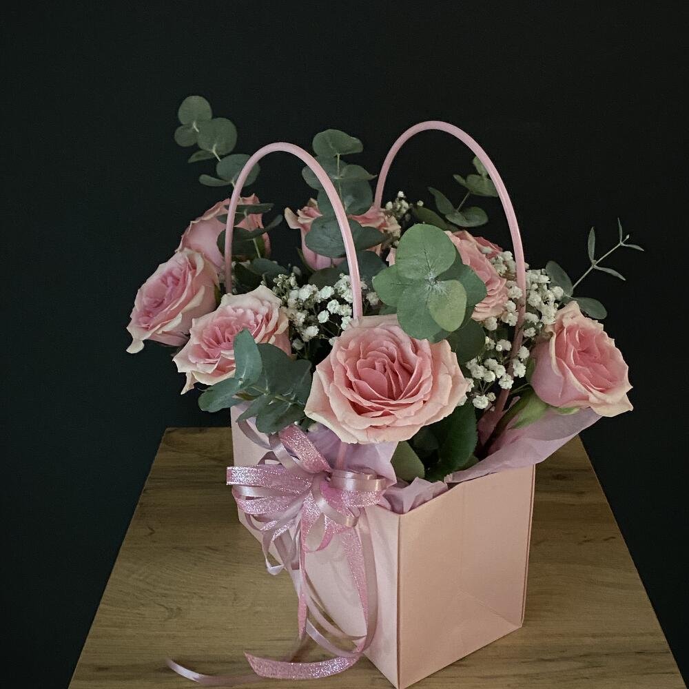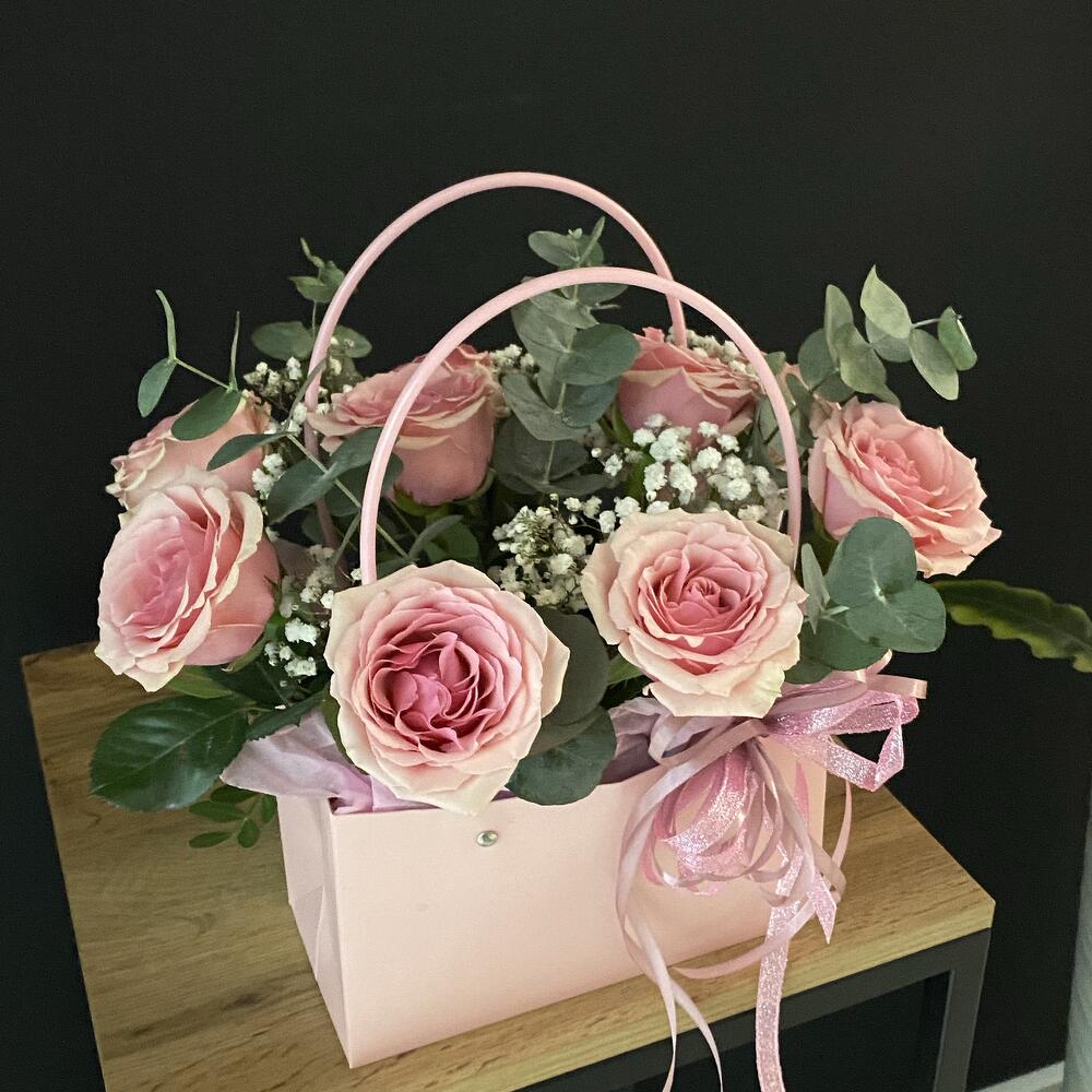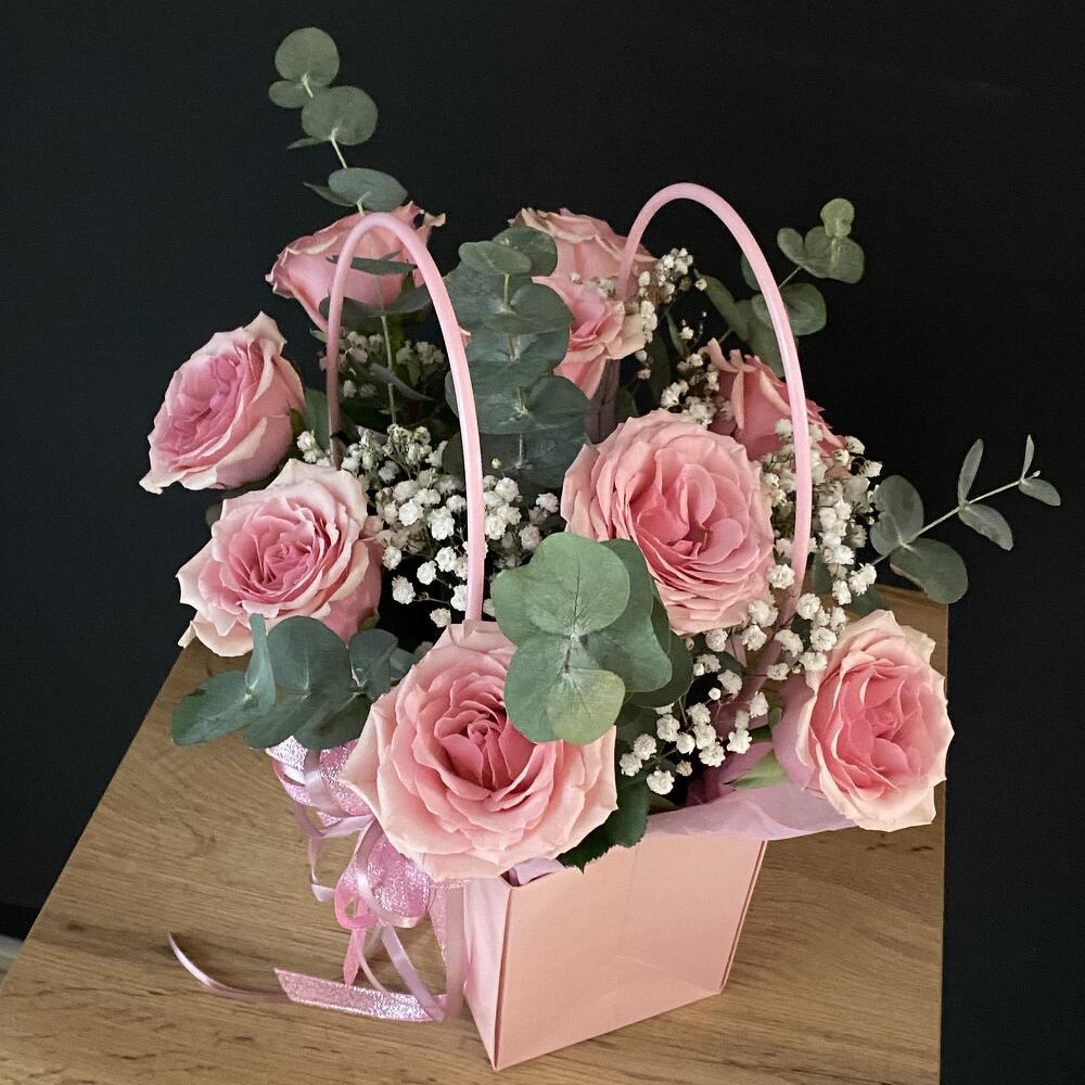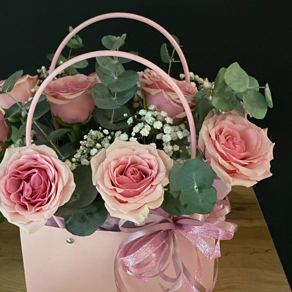 Гипсофила - 1 шт. Эвкалипт - 1 шт. Роза - 9 шт. Лента атласная - 1 шт. Оазис флористический - 1 шт. сумочка с ручками - 1 шт. открытка с вашими пожеланиями - 1 шт.