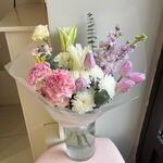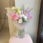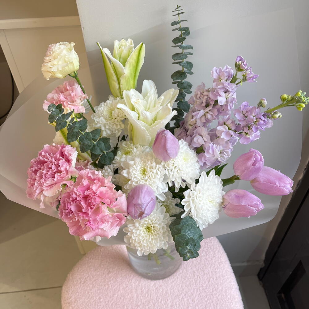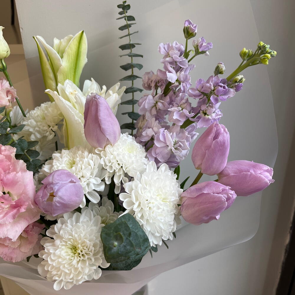 Тюльпан - 5 шт. Лилия Белая - 1 шт. эустома розовая - 2 шт. Хризантема белая кустовая - 3 шт. Эвкалипт Микс - 5 шт. переноска для цветов - 1 шт.