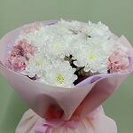 Этот утончённый букет сочетает в себе нежность и изящество: белые хризантемы символизируют искренность и чистоту, а розовые гвоздики добавляют нотку романтики и тепла. Их гармоничное сочетание создаёт ощущение лёгкости и душевного уюта. Такой букет станет прекрасным подарком, передающим заботу, признательность и тёплые чувства.