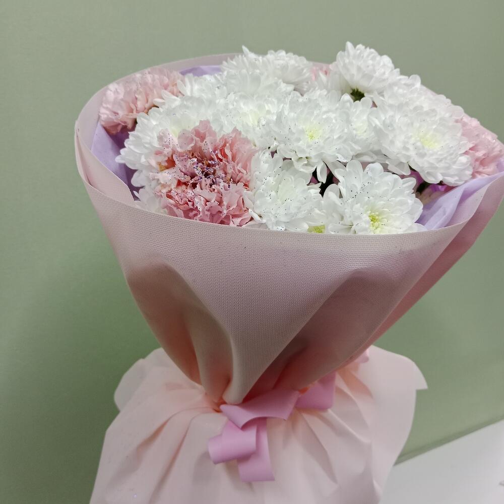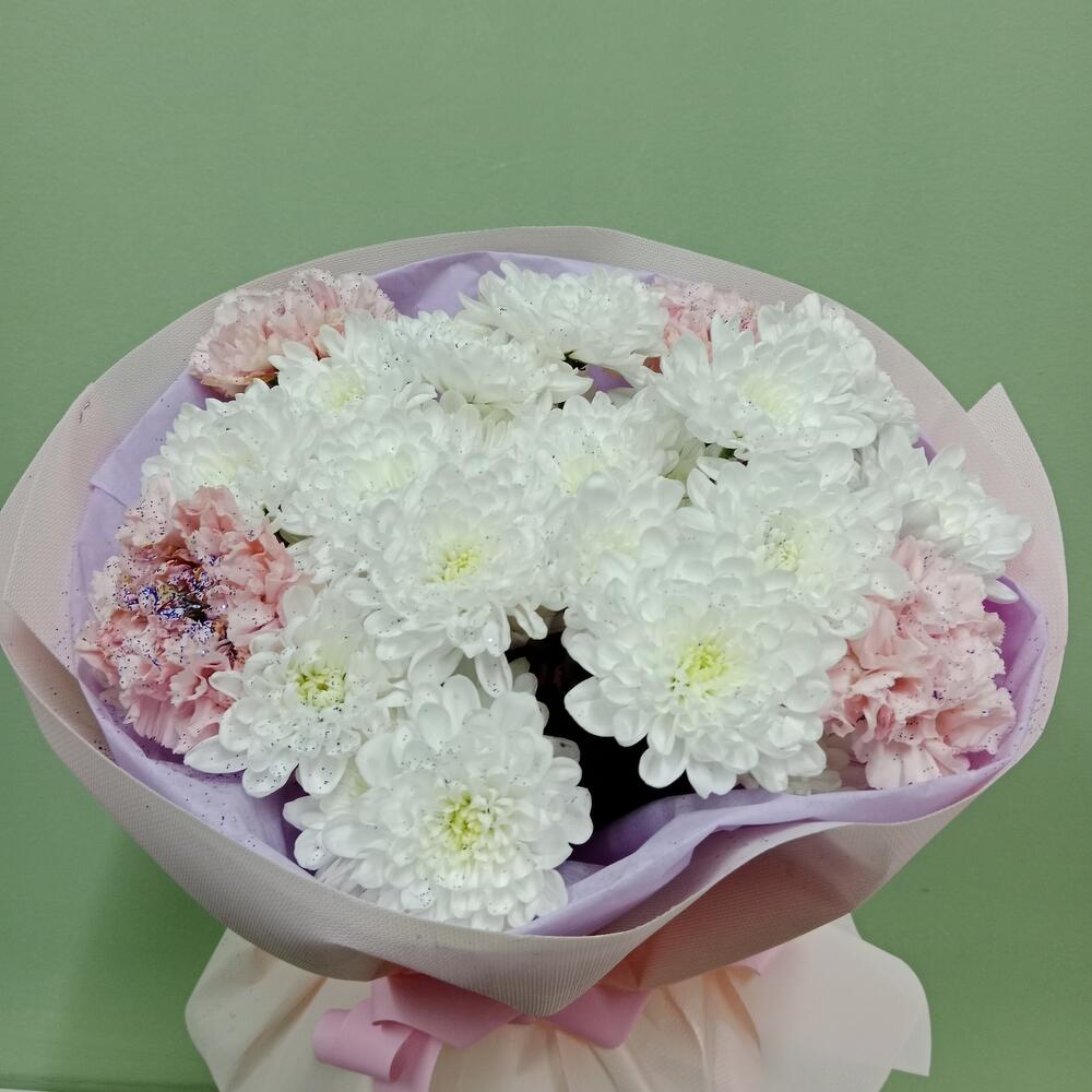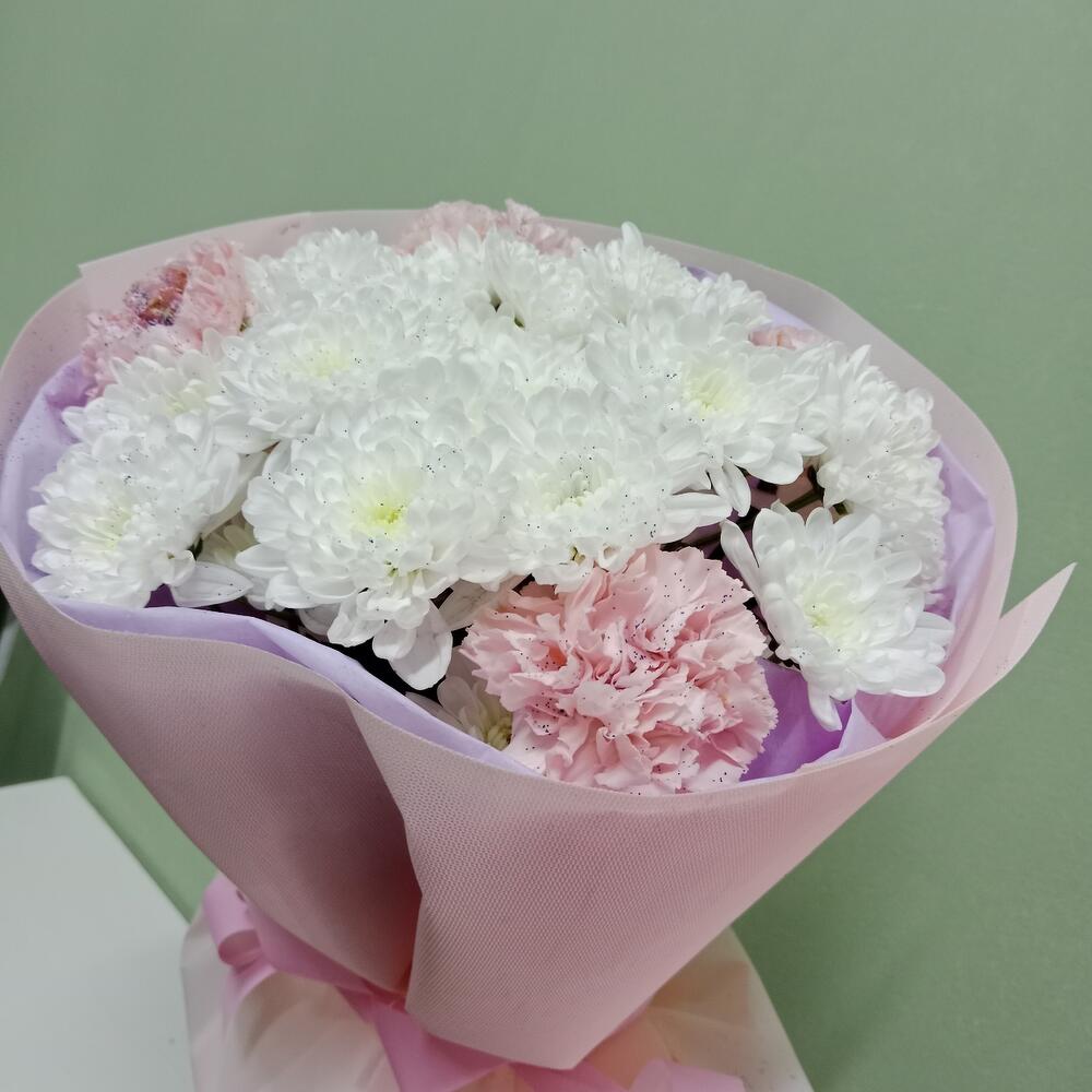 Этот утончённый букет сочетает в себе нежность и изящество: белые хризантемы символизируют искренность и чистоту, а розовые гвоздики добавляют нотку романтики и тепла. Их гармоничное сочетание создаёт ощущение лёгкости и душевного уюта. Такой букет станет прекрасным подарком, передающим заботу, признательность и тёплые чувства.