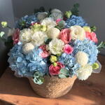 Гортензия - 3 шт. Роза - 8 шт. Кустовая пионовидная роза - 1 шт. Эвкалипт Цинерея - 3 шт. эустома белая - 5 шт. момоко хризантема - 5 шт.