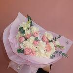 Очаровательный букет в мягких пастельных тонах — воплощение утончённости и нежности. Кремовые и пудрово-розовые пионовидные розы в сочетании с эустомами и веточками эвкалипта создают эффект воздушного облака, наполненного ароматом любви. Упакован в стильную матовую розовую плёнку.