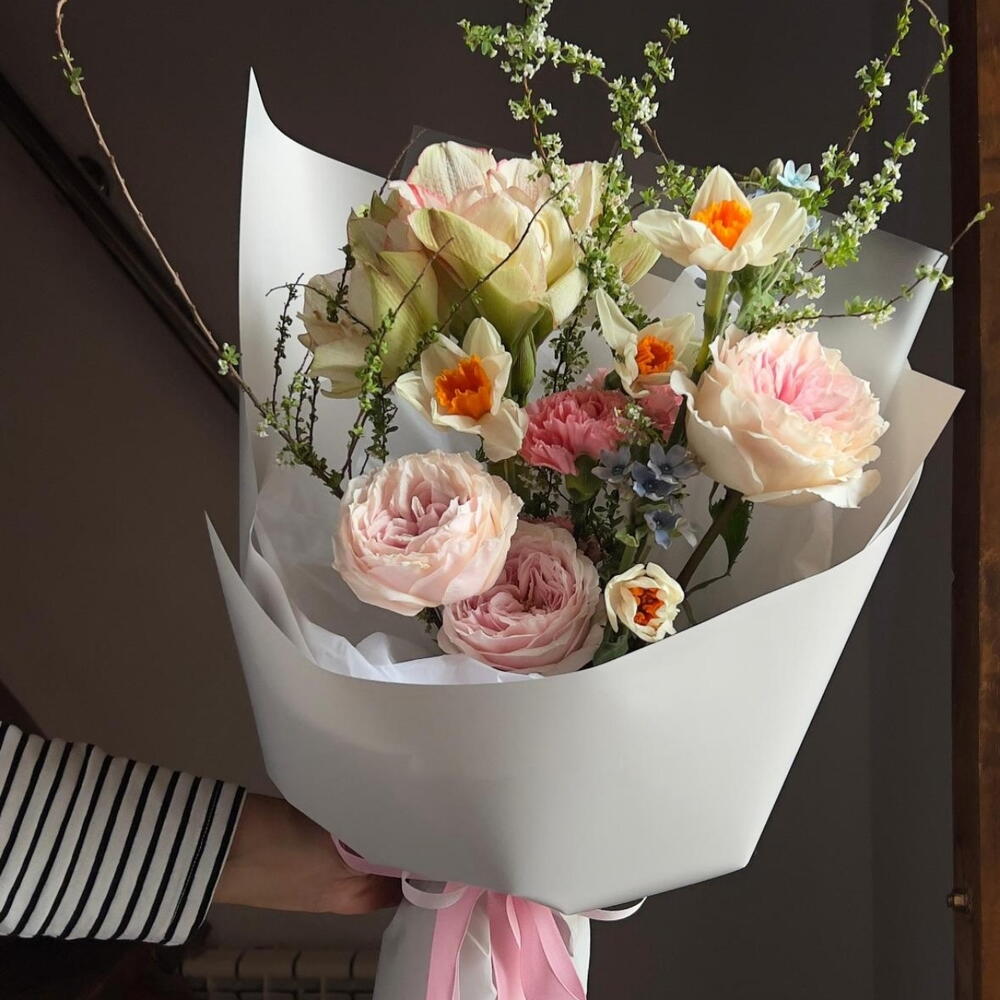 Амариллис - 1 шт. Нарцисс - 4 шт. Диантус - 4 шт. Оксипеталум - 2 шт. Спирея Белая - 1 шт. тсумуги роза - 3 шт.