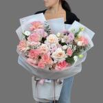 Гипсофила - 3 шт. Лизиантус - 7 шт. Эвкалипт - 2 шт. Гвоздика - 3 шт. хризантемы - 3 шт. розы - 7 шт. пионовидные розы джульетта - 3 шт. аква бумага - 1 шт.