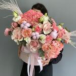 Гортензия - 2 шт. Лизиантус - 4 шт. Хлопок - 3 шт. Эвкалипт - 3 шт. Гвоздика - 5 шт. Сухоцветы - 3 шт. Коробка - 1 шт. джульетта кустовая роза пионовидная - 4 шт. розы - 5 шт.