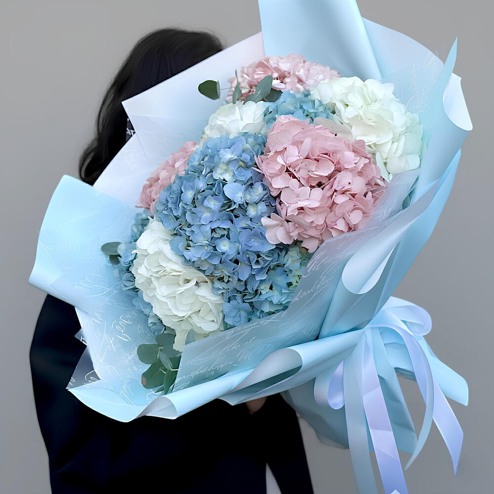 Этот чарующий монобукет из 9 пышных гортензий и 3 веток эвкалипта станет прекрасным украшением любого события. Гортензии великолепно сочетаются с нежными ветками эвкалипта, создавая атмосферу свежести и естественной элегантности. Этот букет подарит великолепное настроение и станет источником только положительных эмоций.