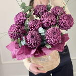 Композиция с хризантемой «Бигуди» - выбор для тех, кто любит яркие акценты и смелую красоту. Глубокий винный цвет — как вечер перед важным признанием. Эта композиция притягивает взгляд сразу, она завораживает. В ней ощущение силы и магнетизма. Она смотрится стильно, необычно и запоминается сразу. Это не милый жест — это выразительное внимание. Это подарок для женщины с характером. Для той, кто чувствует больше, чем говорит. Для момента, который должен запомниться. Оттенок: глубокий винно-сливовый Настроение: магнетизм, уверенность, притяжение Стойкость: до 14 дней Такую композицию выбирают, когда хочется произвести впечатление, когда важно подчеркнуть статус, вкус и характер.