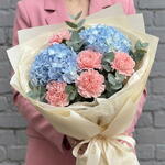 Гортензия - 2 шт. Гвоздика - 5 шт. Лента атлас - 1 шт. Эвкалипт Цинерея - 1 шт. Калька упаковка - 4 шт. аквабумага - 6 шт.