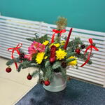 Альстромерия - 1 шт. Хризантема кустовая - 1 шт. Шишки - 4 шт. Новогодний декор - 2 шт. Нобилис - 1 шт. Свеча новогодняя - 1 шт. Игрушки елочные - 5 шт.