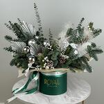 Эвкалипт - 2 шт. Коробка - 1 шт. Шишка - 3 шт. Новогодний декор - 3 шт. Новогодние шары - 6 шт. Оазис флористический - 1 шт. нобилис ветка - 1 шт. банановый лист - 3 шт.