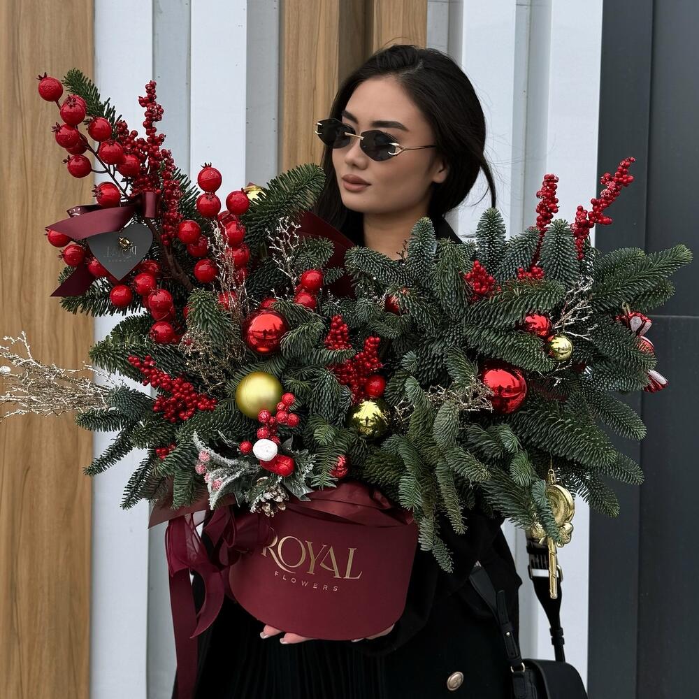 Коробка - 1 шт. Новогодние шары - 5 шт. Декор новогодний - 2 шт. Оазис флористический - 1 шт. нобилис ветка - 3 шт. илекс искусственный (декор) - 4 шт.