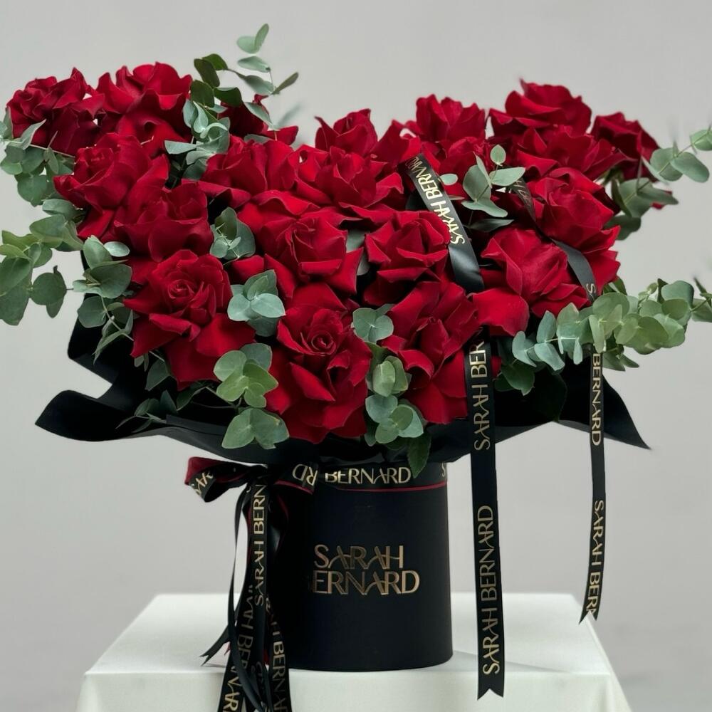 Эвкалипт - 7 шт. Коробка - 1 шт. Голландская роза - 19 шт.
