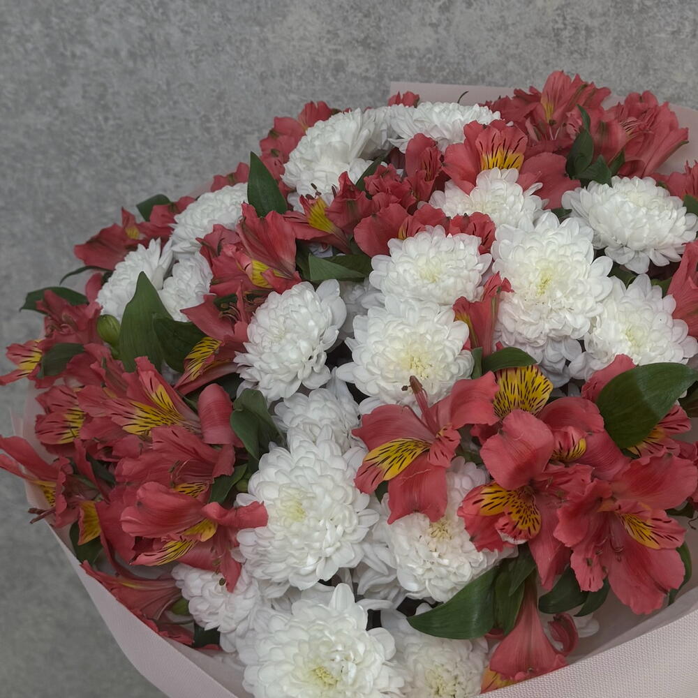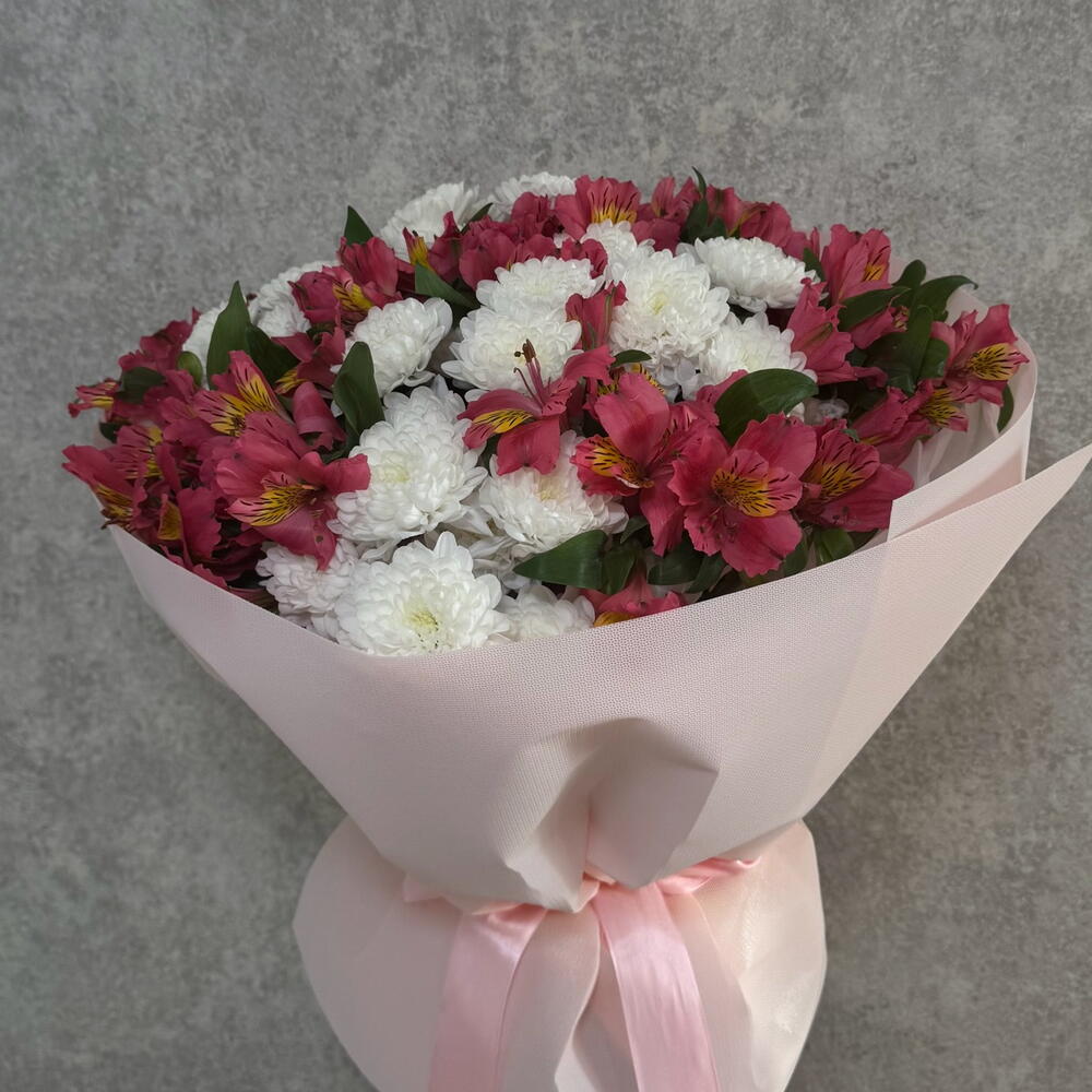 Невероятно стойкий букет, в составе нежная альстрамерия и белая хризантема. Примечание: Цвет Альстрамерии может меняться смотря на поступление или желанию клиента.🫶 Подойдет для любительниц стойких букетов, а так же для мамы или сестры.🌸 Подпишем и положим открытку в подарок 🎁 Так же можем распечатать именную ленту с пожеланиями ✨
