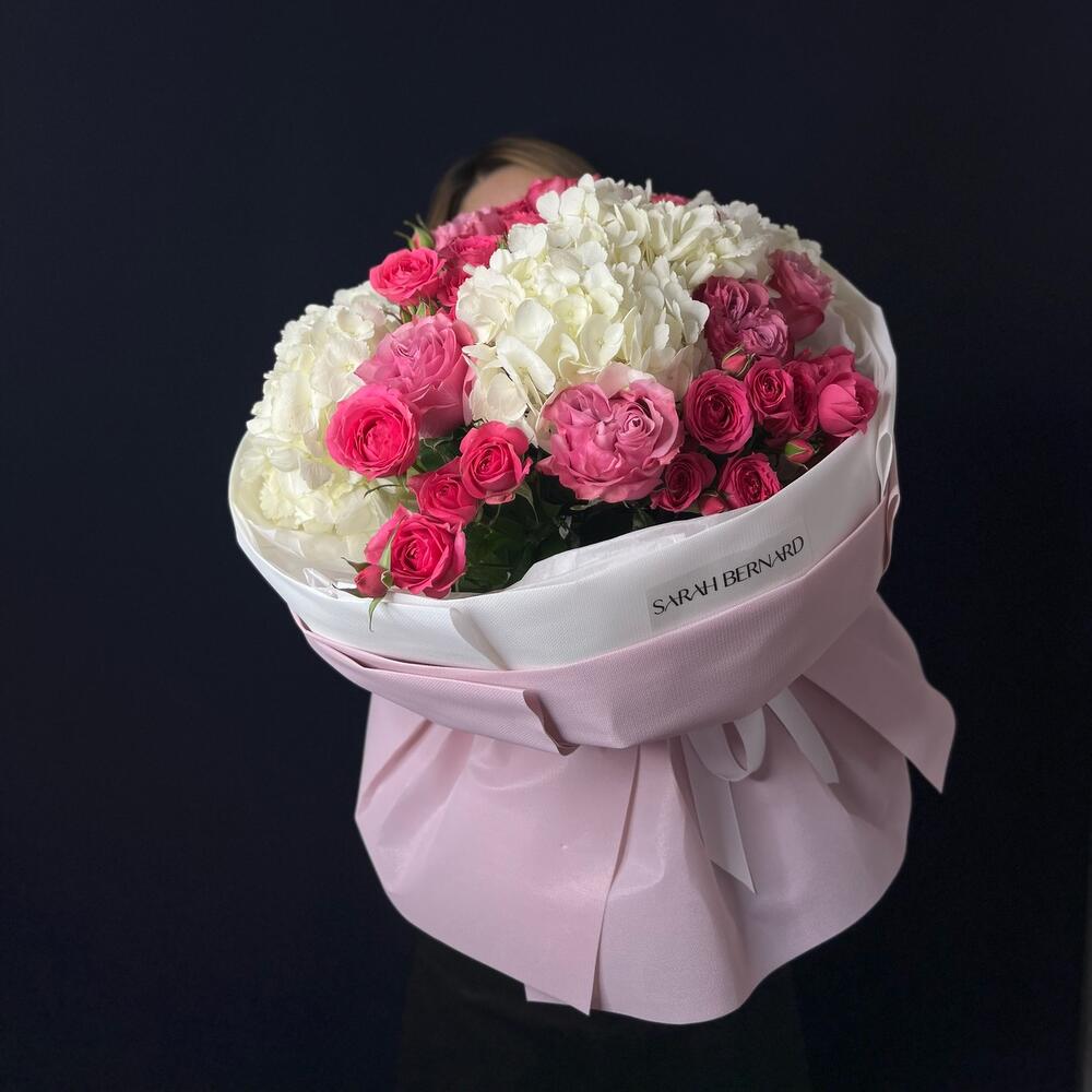 Гортензия - 3 шт. Роза кустовая - 4 шт. Роза - 7 шт. Оформление - 1 шт.