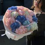 Это роскошный и очень объёмный букет из гортензий разных оттенков: нежно-розовых, небесно-голубых, сливочно-белых и насыщенно-синих. Цветы собраны плотной “шапкой”, что создаёт эффект облака из лепестков. Дополнительно букет украшен фирменными лентами Gracia, подчёркивающими его стиль и премиальность. Такой букет выглядит празднично, эффектно и элегантно — идеально для важных событий, признаний и подарка «с вау-эффектом».