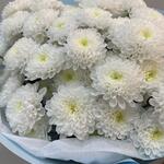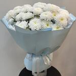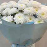 Очаровательный букет из белоснежных хризантем, оформленный в стильную голубую упаковку. Идеален для выражения искренних чувств — благодарности, заботы или просто хорошего настроения.