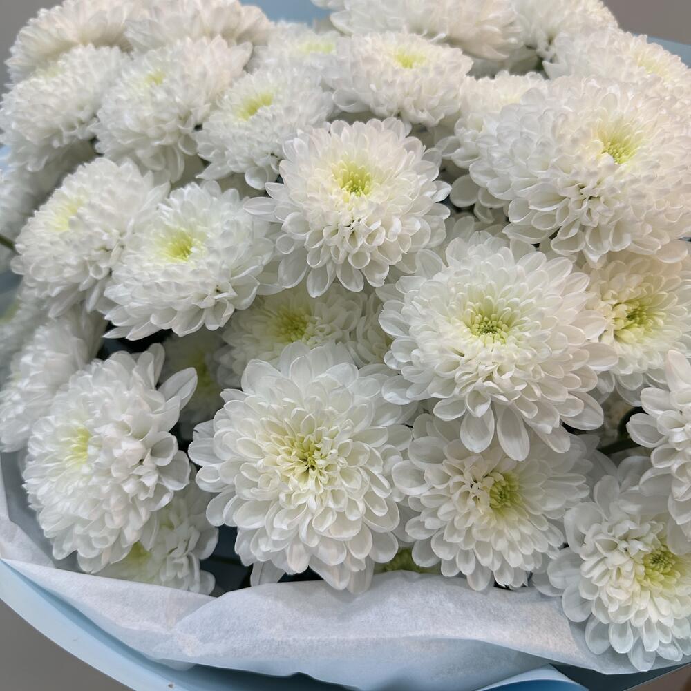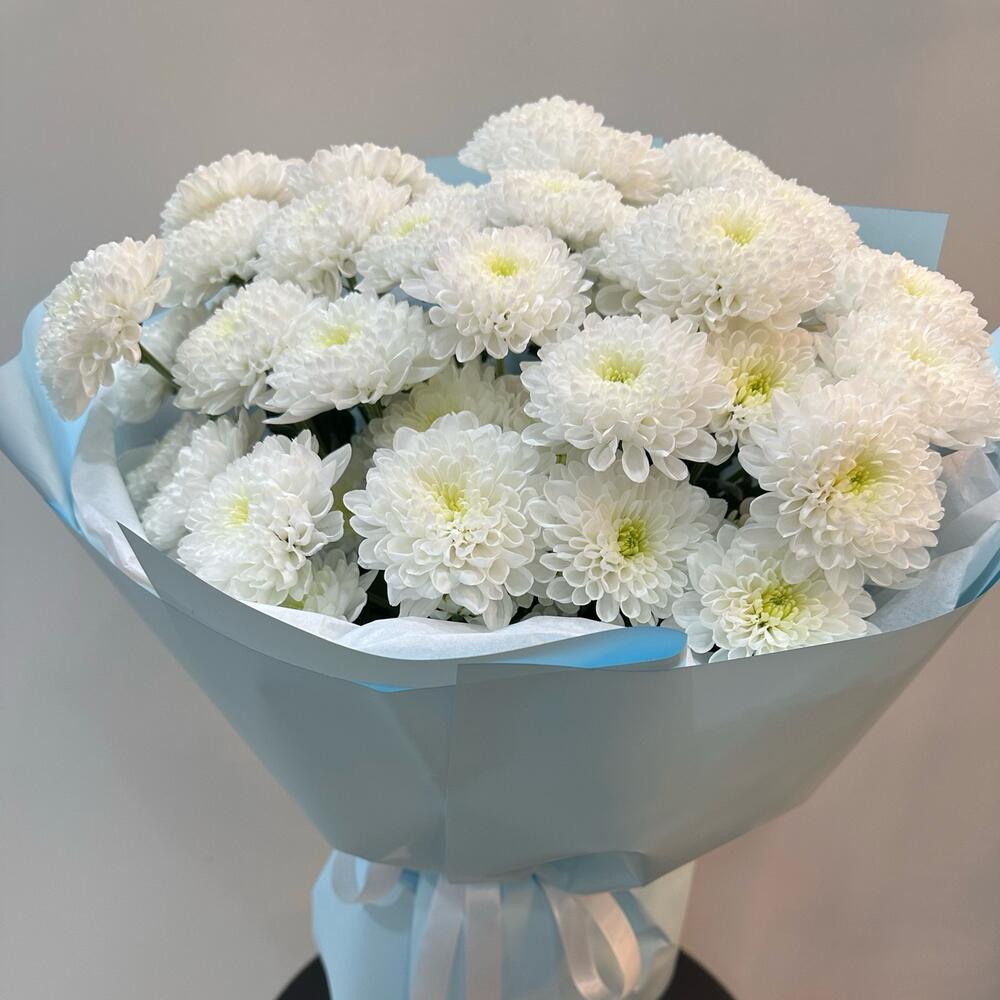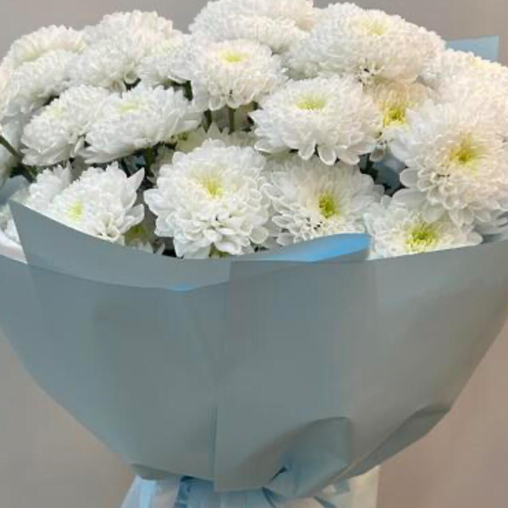Очаровательный букет из белоснежных хризантем, оформленный в стильную голубую упаковку. Идеален для выражения искренних чувств — благодарности, заботы или просто хорошего настроения.