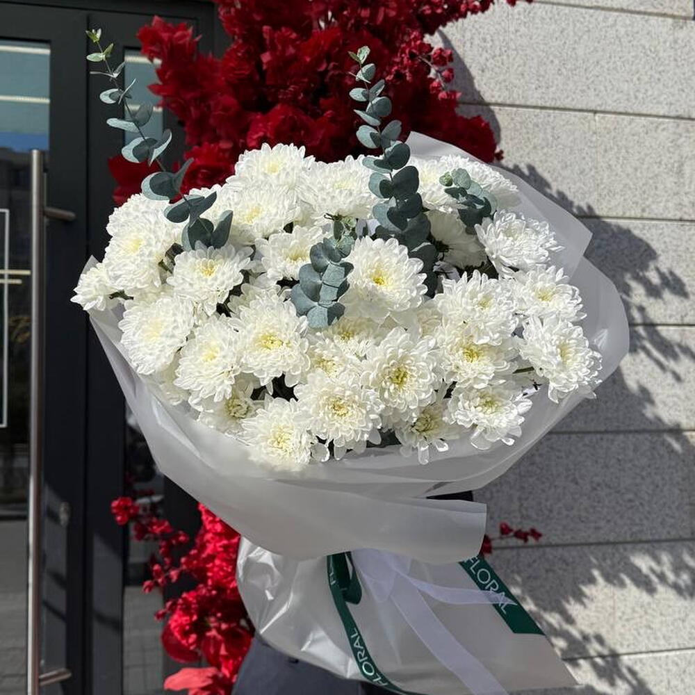 Убедительный и изысканный: этот монобукет из 7 штук пышных кустовых хризантем и 1 шт. ароматного эвкалипта не оставит равнодушным ни одного ценителя флористического искусства. Он олицетворяет гармонию, радость и красоту природы, переданную через нежные лепестки и притягательную зелень. Идеально подходит в качестве подарка на любой праздник или просто как способ привнести нотку свежести в повседневную жизнь.