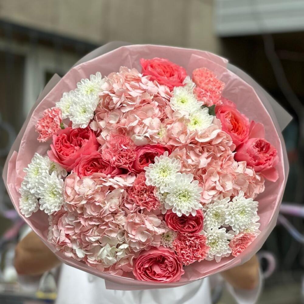 Гортензия - 3 шт. Хризантема - 3 шт. Гвоздика - 7 шт. Пионовидная роза - 7 шт.