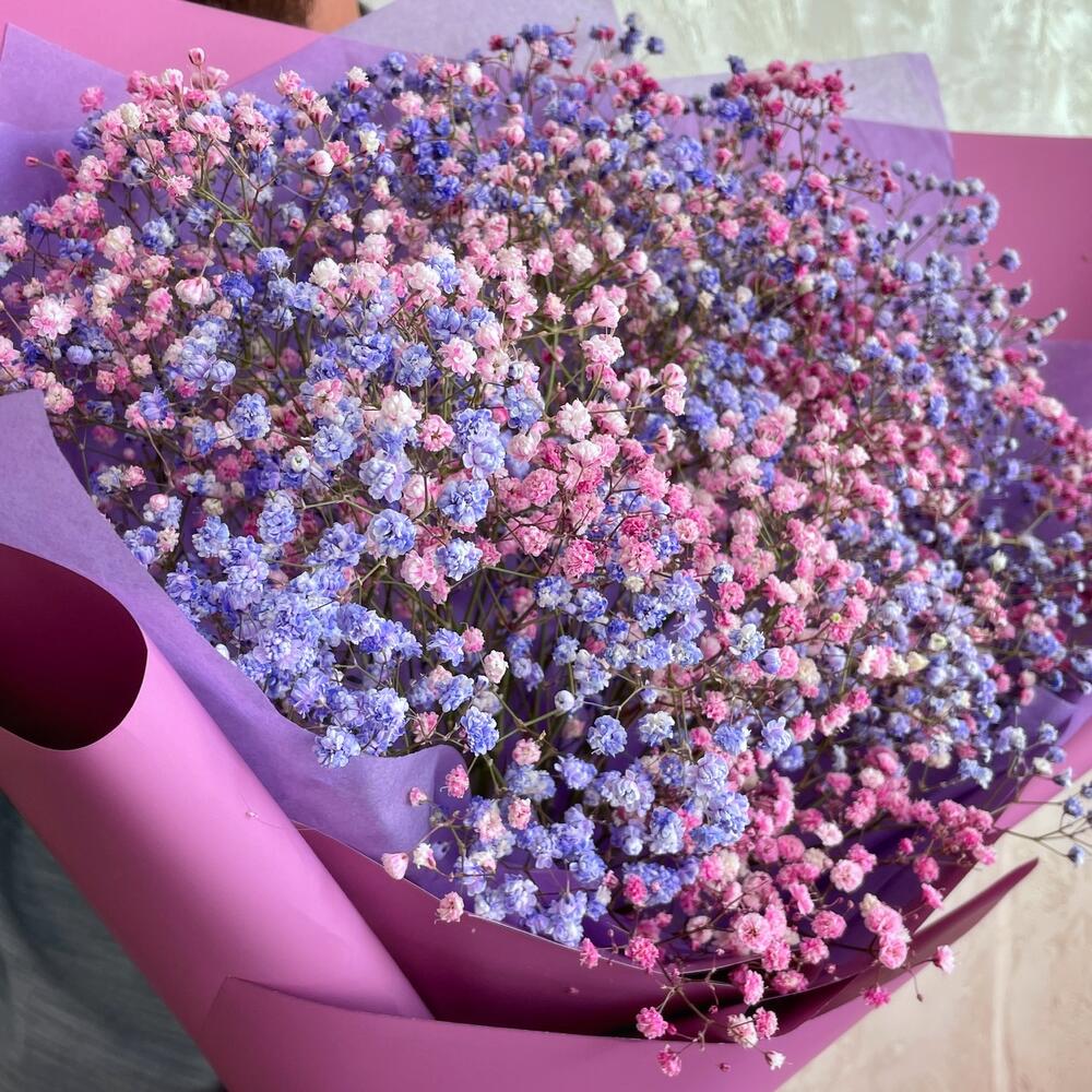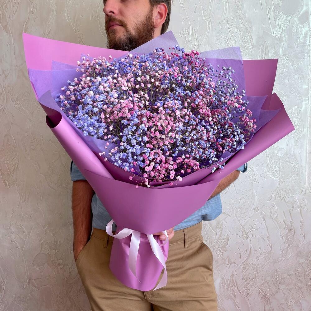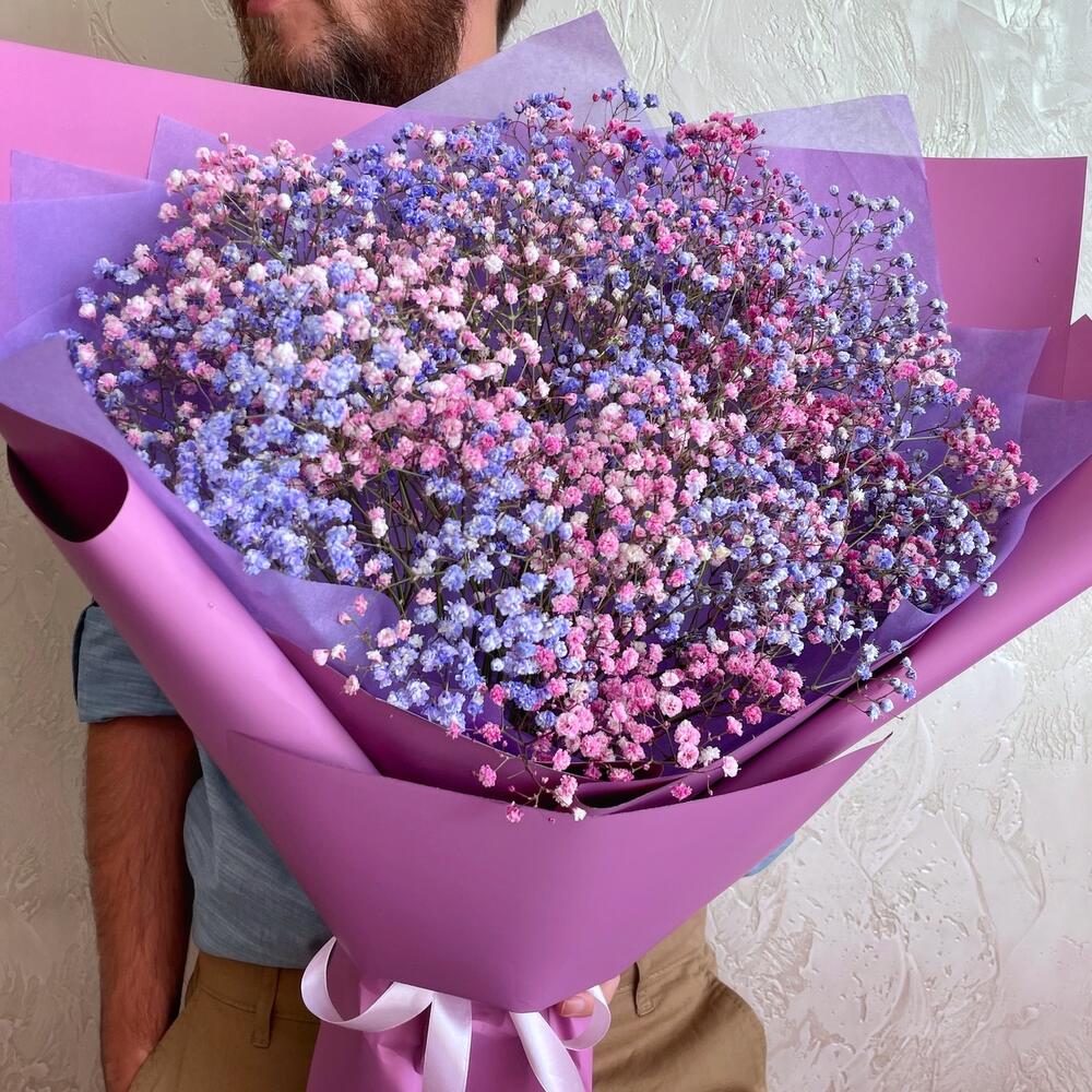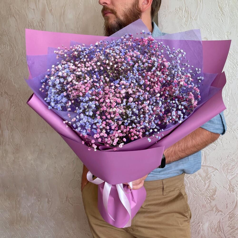 Лента атласная - 1 шт. Упаковка тишью - 2 шт. Гипсофила розовая - 5 шт. гипсофила сиреневая - 6 шт. упаковка пленка цветная - 4 шт.