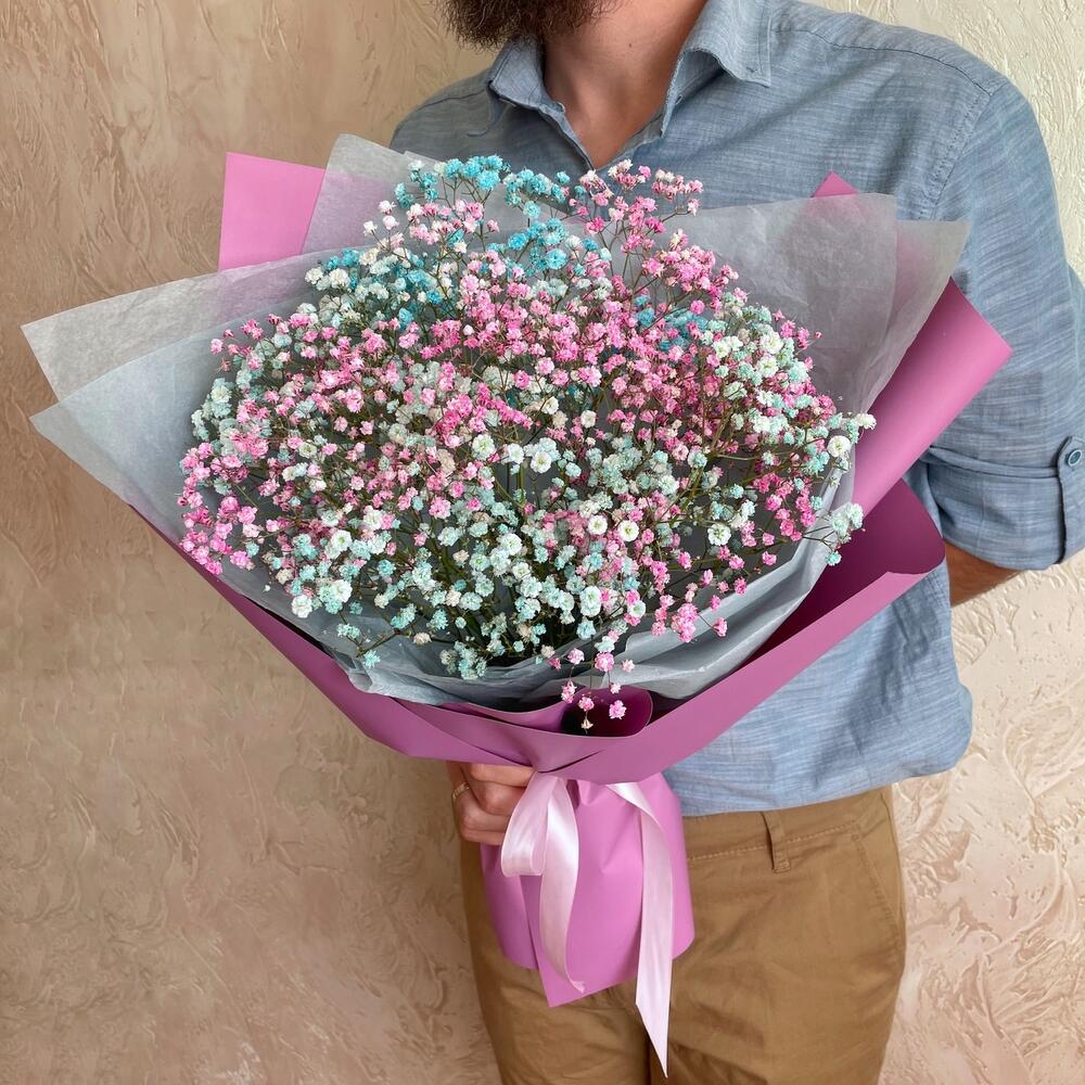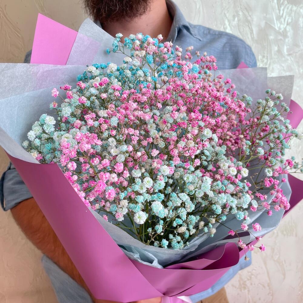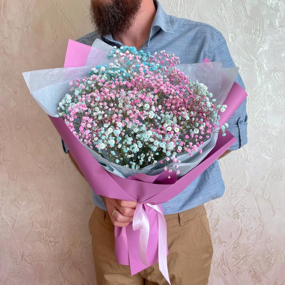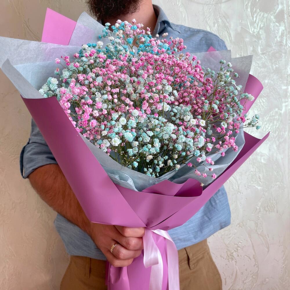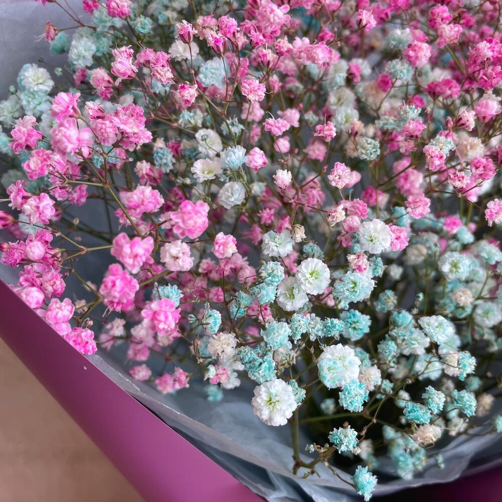 Лента атласная - 1 шт. Тишью - 2 шт. Гипсофила розовая - 4 шт. гипсофила бирюзовая - 3 шт. упаковка пленка цветная - 3 шт.
