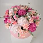 Очень красивая композиция выполнена из нежных гортензий и роз, создаст красивую атмосферу в квартире. Эта композиция идеально подходит для особых случаев и праздников, когда вы хотите порадовать близкого человека или выразить свою глубокую любовь.