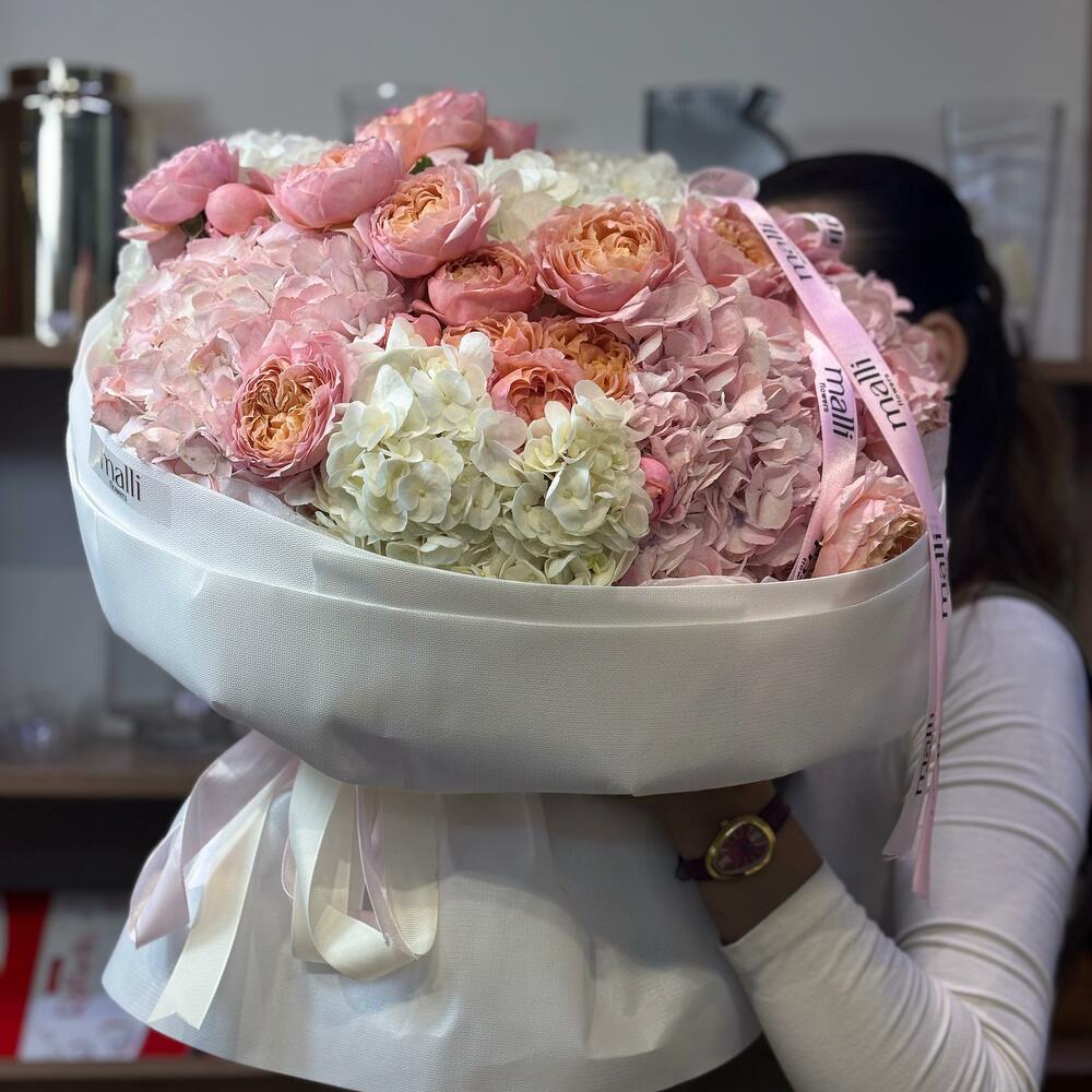 Гортензия - 5 шт. Эвкалипт - 1 шт. Кустовая пионовидная роза - 10 шт.