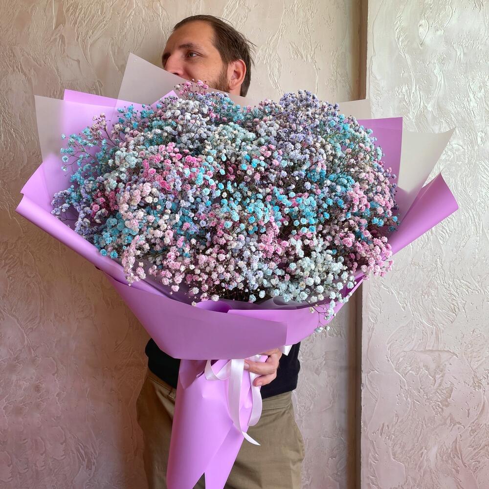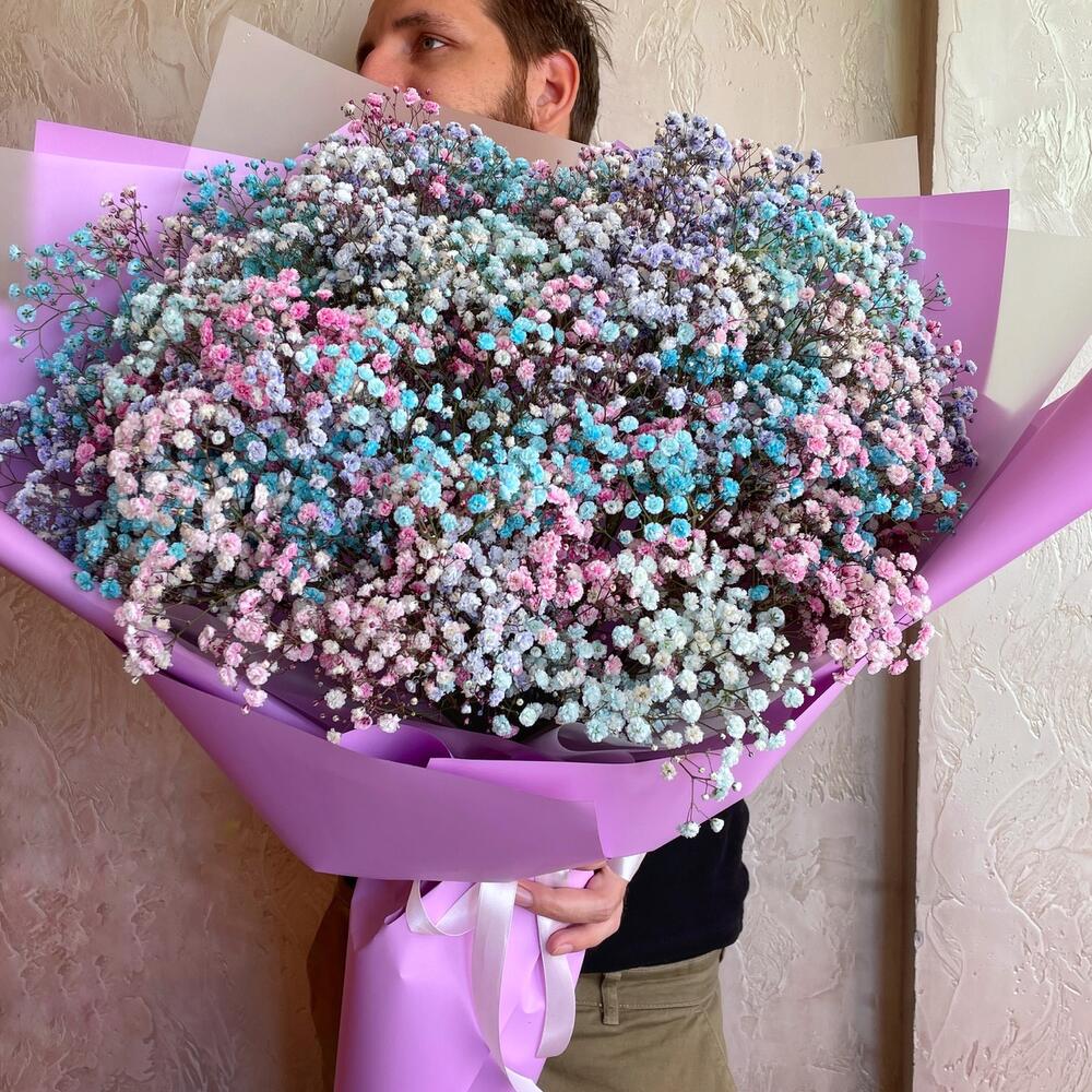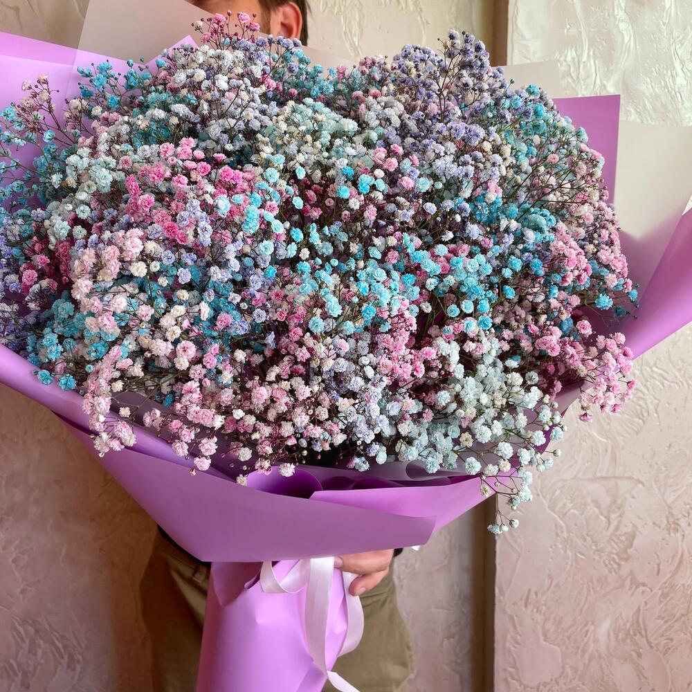 Лента атласная - 1 шт. Гипсофила розовая - 5 шт. Упаковка пленка матовая - 3 шт. Гипсофила голубая - 5 шт. Гипсофила фиолетовая - 5 шт. упаковка пленка цветная - 5 шт.