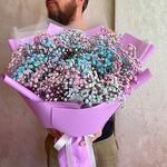 Лента атласная - 1 шт. Гипсофила розовая - 3 шт. Упаковка пленка матовая - 2 шт. Гипсофила голубая - 3 шт. Гипсофила фиолетовая - 3 шт. упаковка пленка цветная - 4 шт.