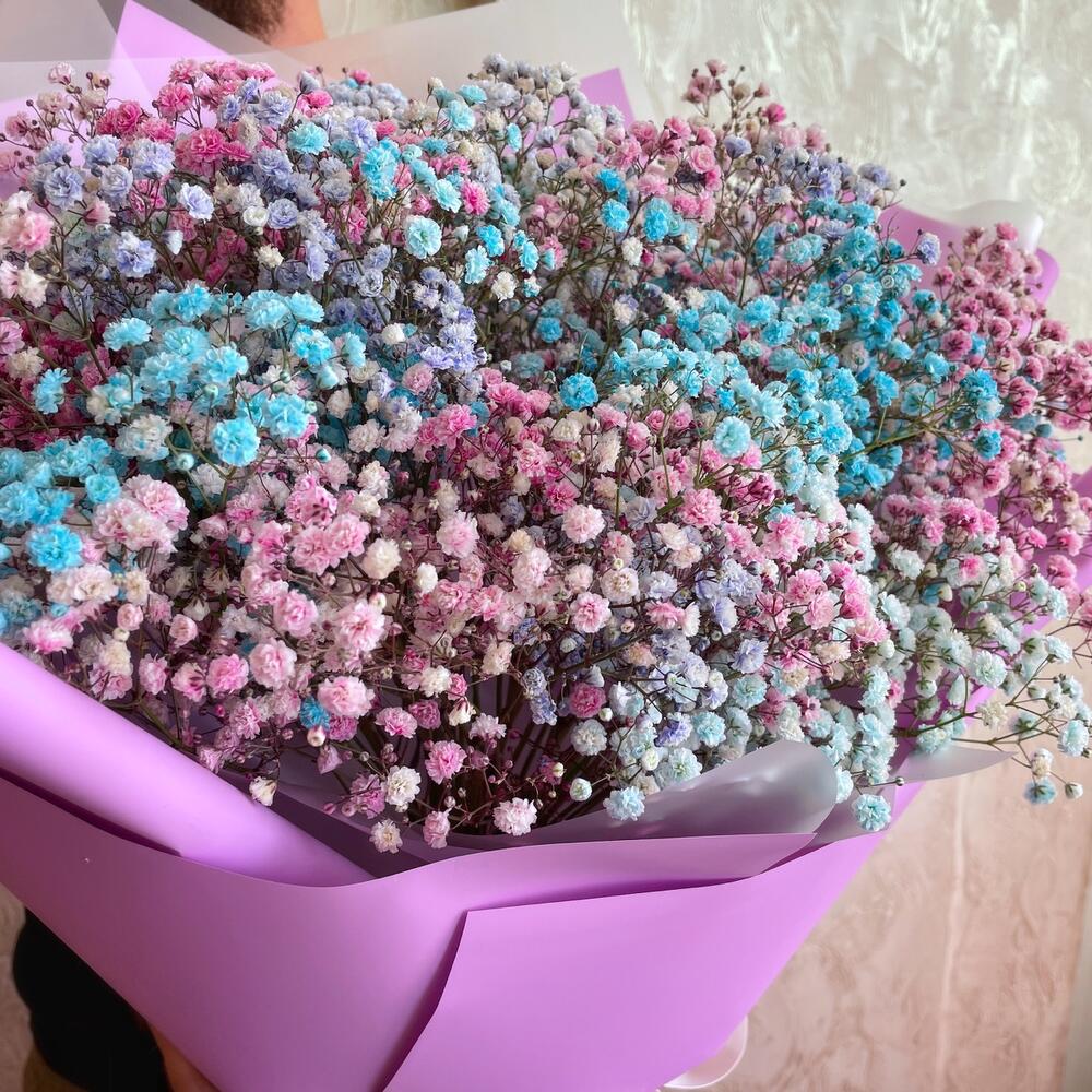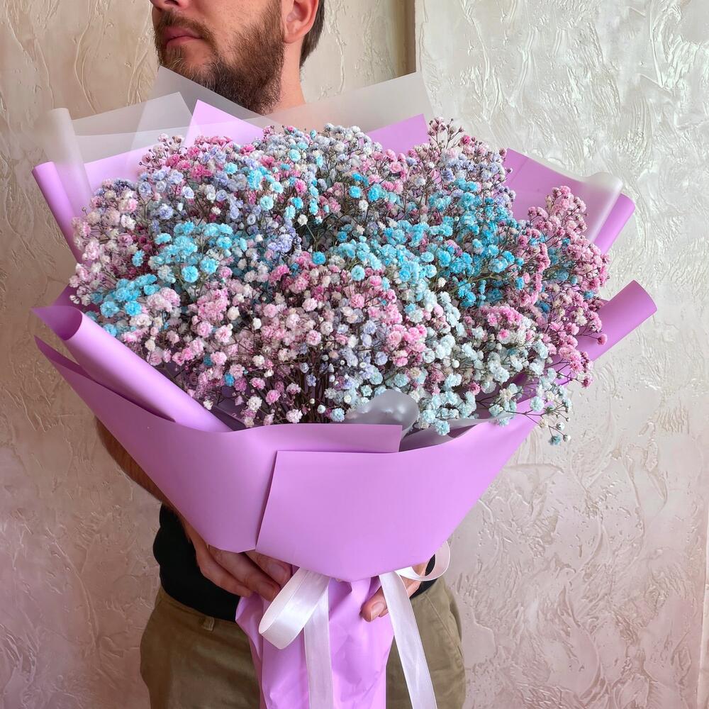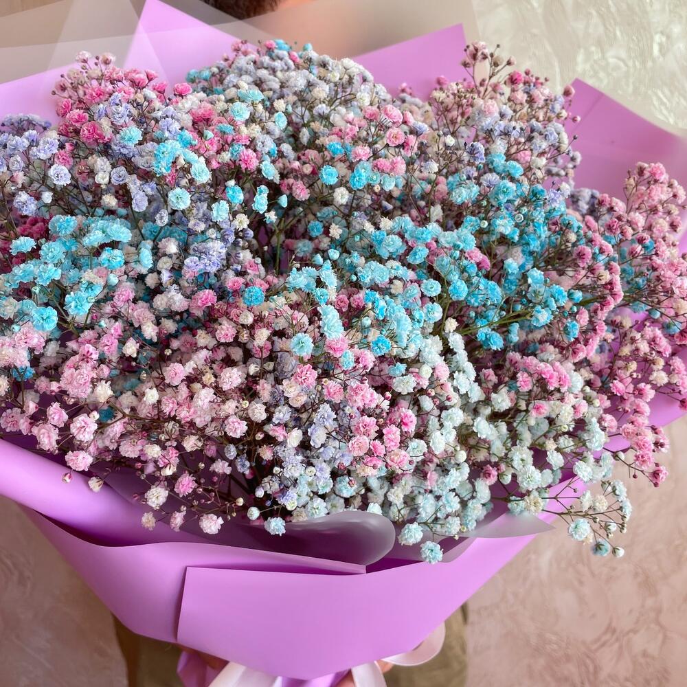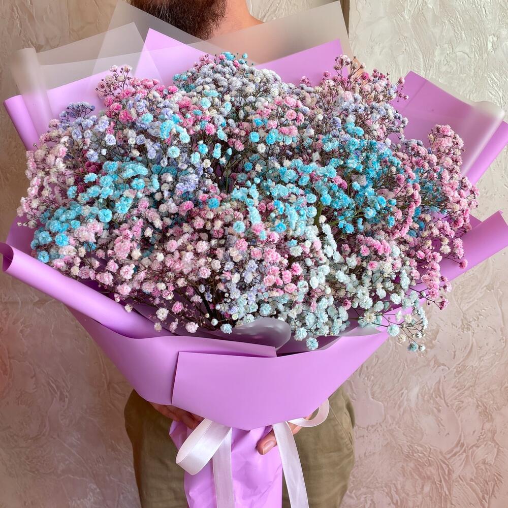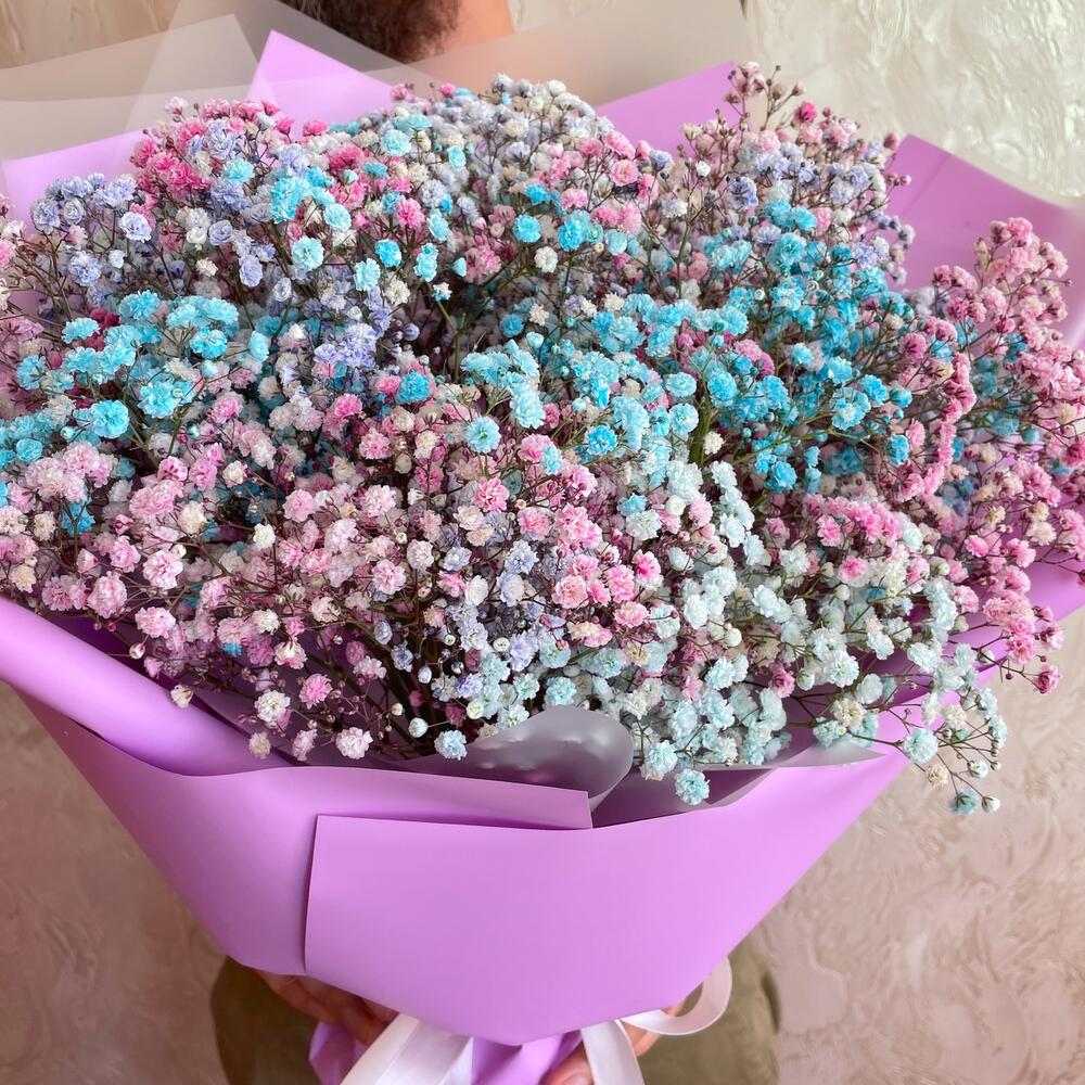 Лента атласная - 1 шт. Гипсофила розовая - 3 шт. Упаковка пленка матовая - 2 шт. Гипсофила голубая - 3 шт. Гипсофила фиолетовая - 3 шт. упаковка пленка цветная - 4 шт.