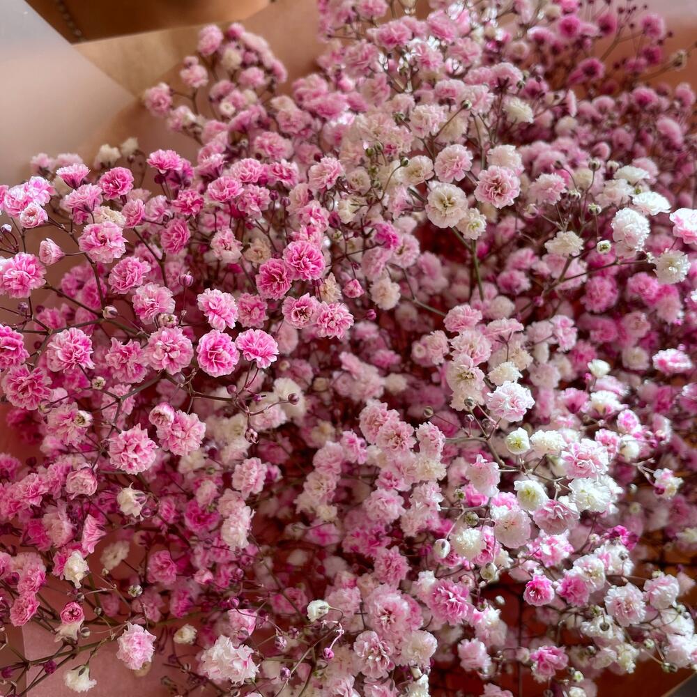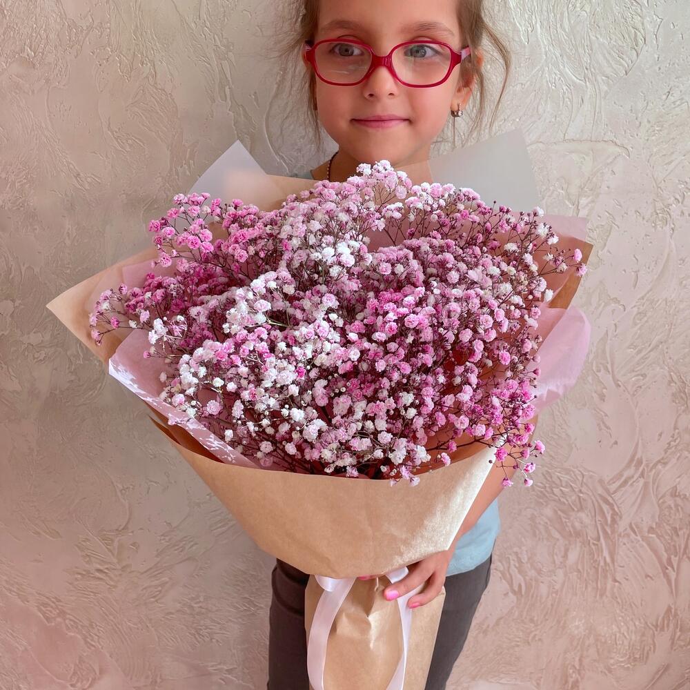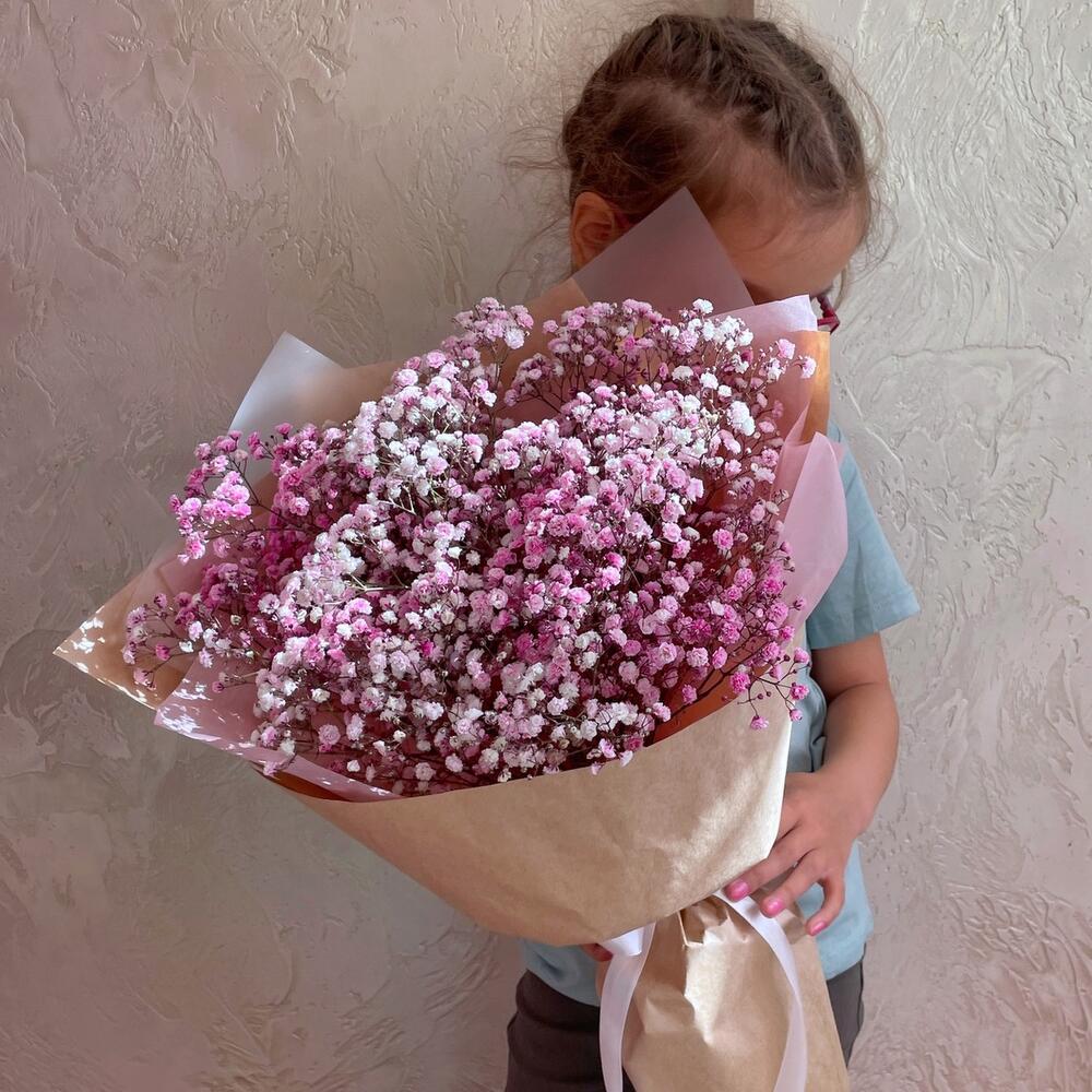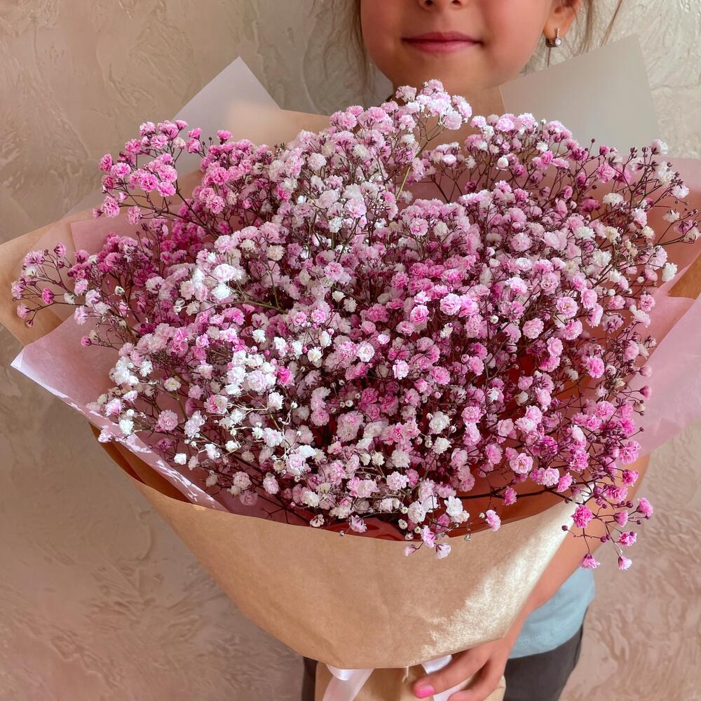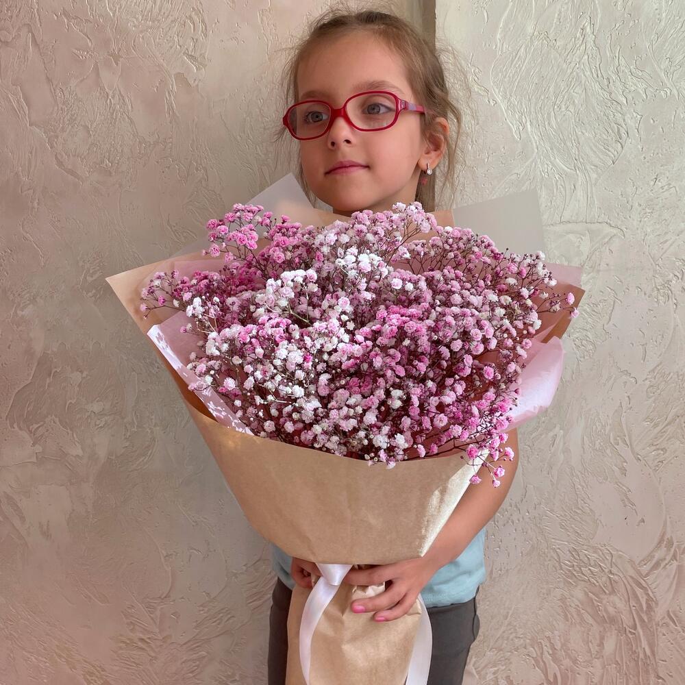 Гипсофила - 5 шт. Лента атласная - 1 шт. Упаковка тишью - 2 шт. Упаковка пленка матовая - 1 шт. Упаковка крафт - 2 шт.