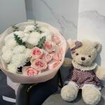 Очаровательный букет из белых кустовых хризантем, нежных роз и ароматного эвкалипта — как тёплое объятие. В композиции — мягкий плюшевый медвежонок в платье, который делает подарок ещё трогательнее. Идеален для признаний, поздравлений и просто чтобы порадовать близкого человека