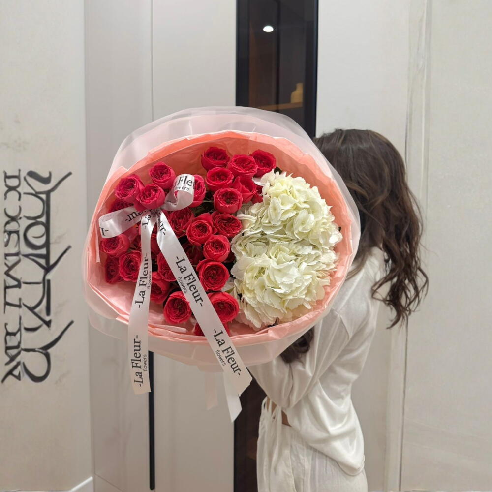 Букет из кустовых роз и гортензии — универсальный вариант для любого повода. Пышная гортензия создаёт объём, а множественные бутоны кустовых роз делают композицию воздушной и романтичной. Подходит для дня рождения, юбилея, благодарности, поздравления с повышением. Если вы ищете «букет с гортензией купить», «красивый букет для девушки», «объёмные цветы доставка», эта композиция станет отличным выбором. Мы тщательно подбираем оттенки и оформляем букет в стильную упаковку