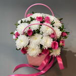 Кустовая роза - 2 шт. Кустовая хризантема - 2 шт. Сумочка - 1 шт. Фисташка пучок - 1 шт. Оазис флористический - 1 шт.