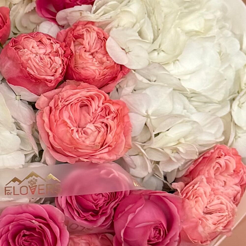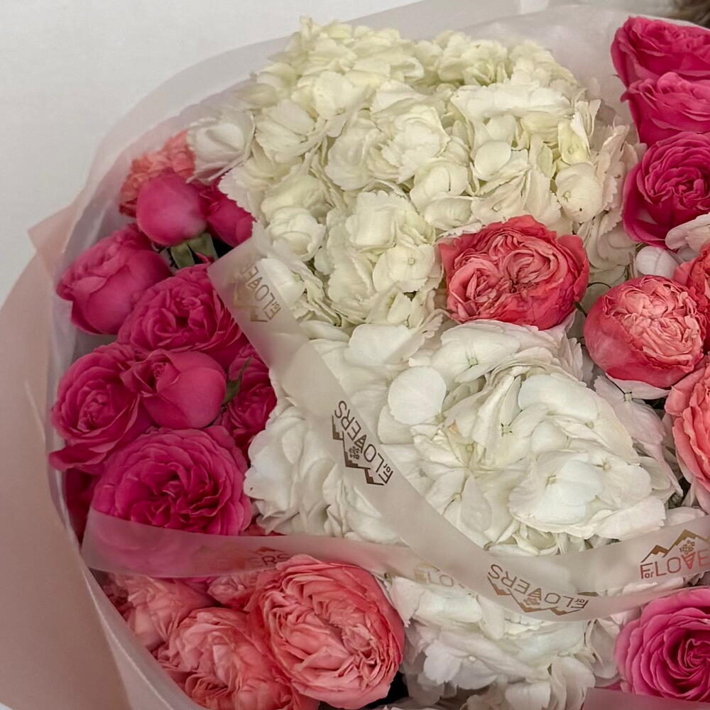 Гортензии и спрей розы в сочетании друг с другом создают невероятное впечатление. Очень нежный, стильный и пышный букет покорит сердце любой девушки.