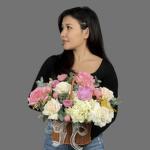 Гортензия - 1 шт. Корзина - 1 шт. Лизиантус - 1 шт. Пион - 1 шт. Роза Джульетта - 2 шт. Голландская роза - 9 шт.