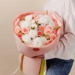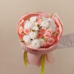 Нежный букет в составе со стойкими хризантемами и кустовыми розами.