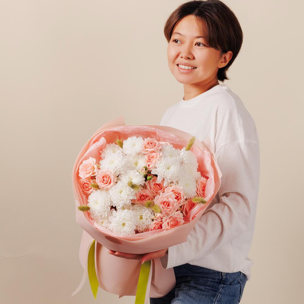 Нежный букет в составе со стойкими хризантемами и кустовыми розами.