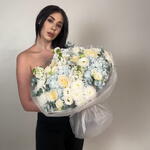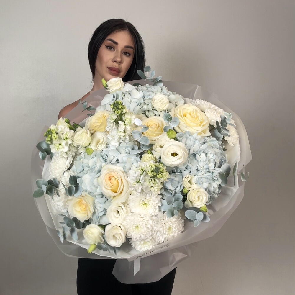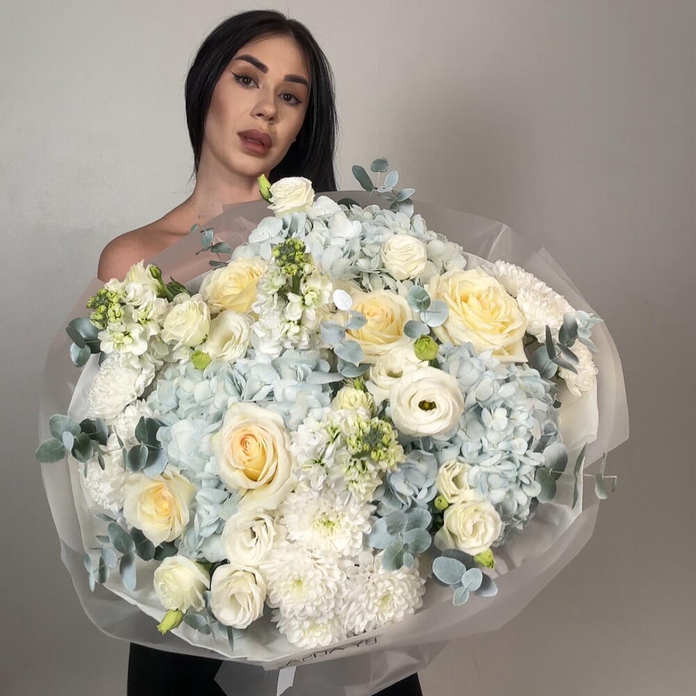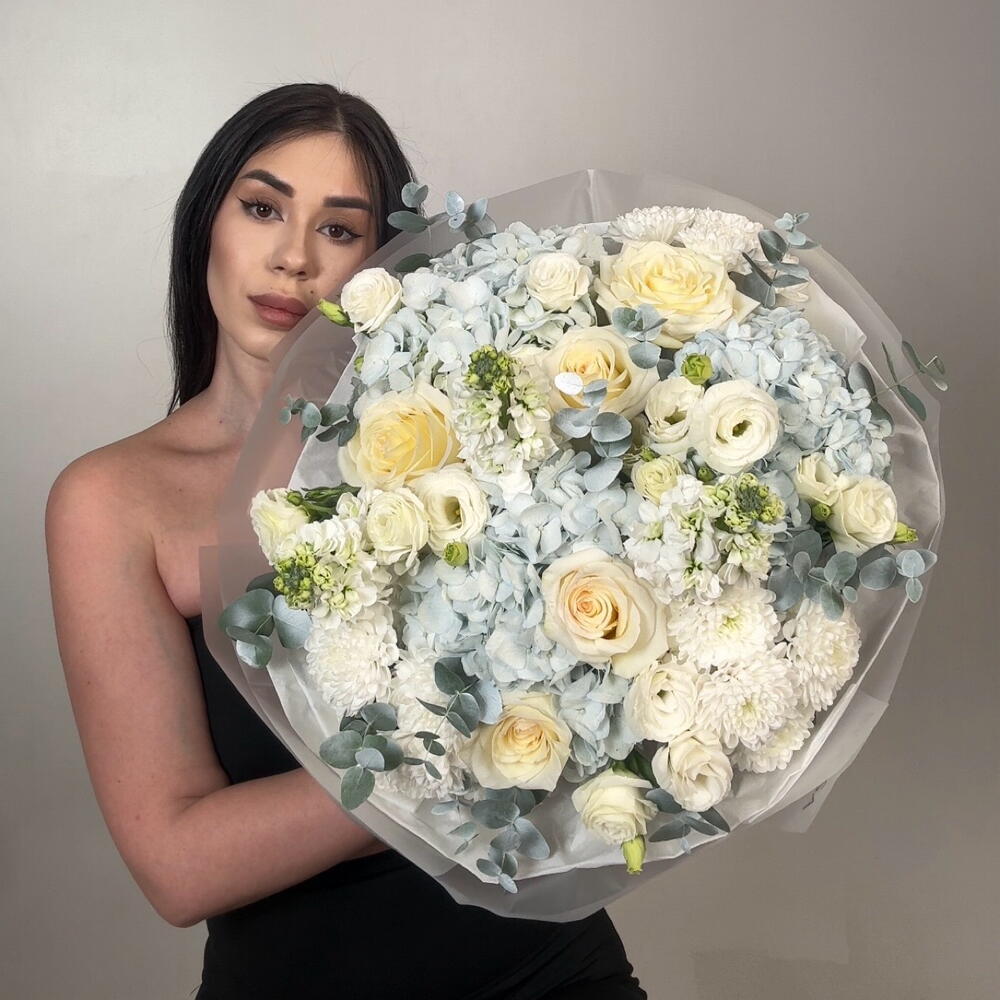 Нежный пышный евро-букет в бело-голубых оттенках Отличный выбор для дня рождения, свидания или сюрприза без повода. 📏 Диаметр букета ~60–65 см 🎁 Красивая упаковка включена
