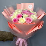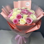 Букет роз 25 шт в элегантном оформлении и в упаковке в аква бумагу. Шарм белого и розового, сочетание чистоты и искренности скажет все без слов! Наслаждайтесь!